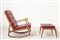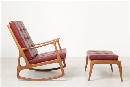 UNA POLTRONA A DONDOLO E UN POGGIAPIEDI, anni '60. Legno di teak, imbottiture...