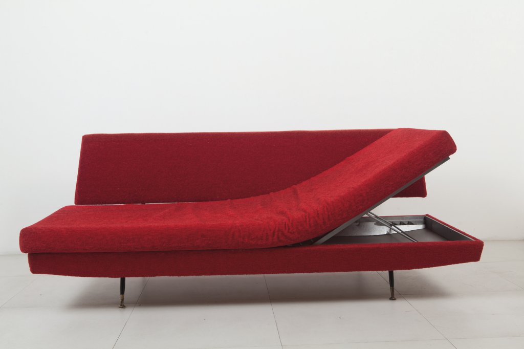 UN DIVANO, anni '60. Supporto di ferro verniciato, imbottiture rivestite in...