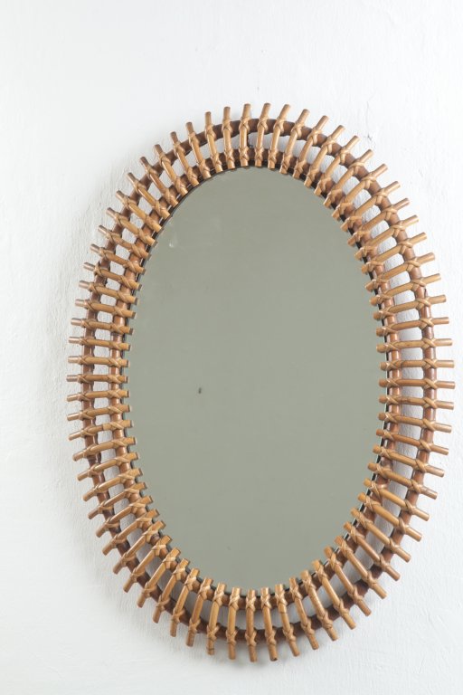 UNO SPECCHIO DA PARETE, anni '60. Bambù, canna d'India, cristallo argentato....