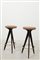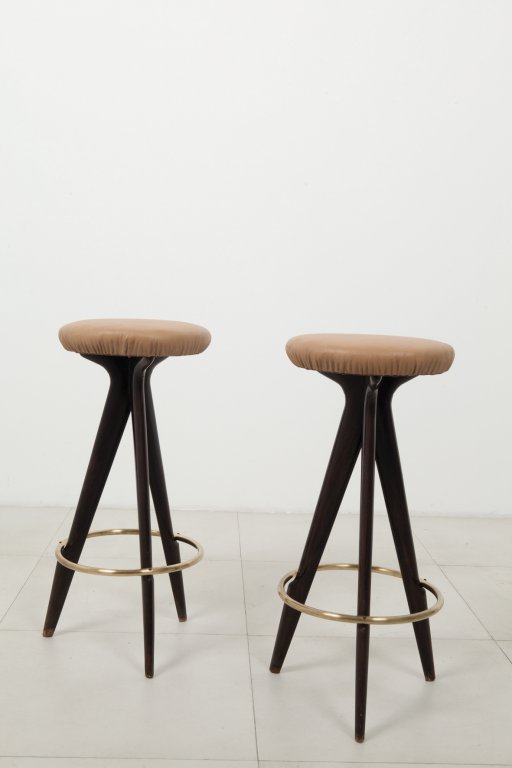 DUE SGABELLI DA BAR, anni '60. Legno di mogano tinto all'anilina, ottone,...