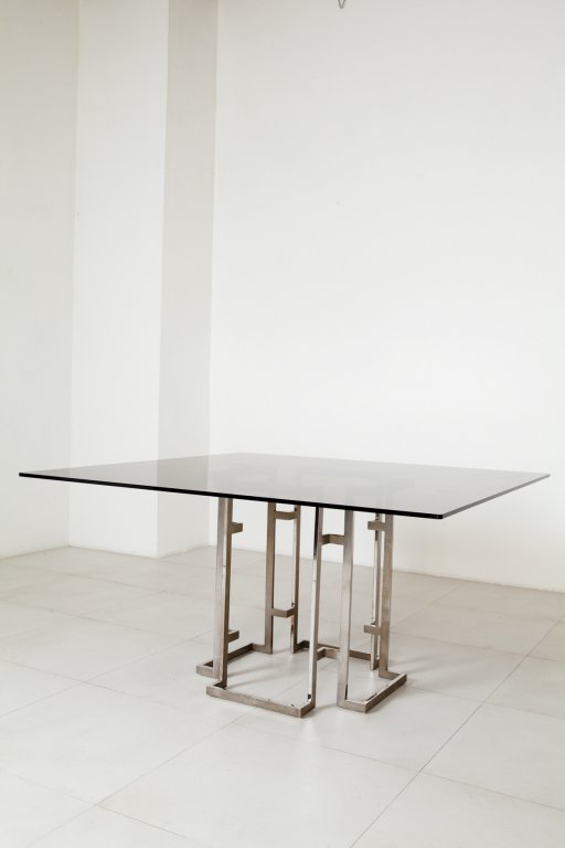 UN TAVOLO, anni '70. Acciaio cromato, cristallo fumé. Cm 72 (h) x 140 x 140.