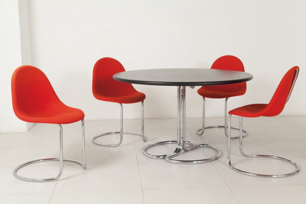 Tavolo (acciaio cromato, legno laccato): altezza cm 72, diametro cm 120