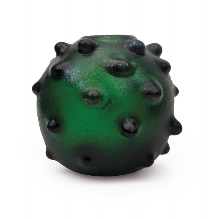 A vase in green corroso glass with applied bugne made by VENINI, CIRCA 1936,