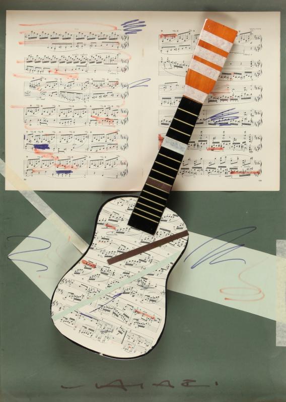GIUSEPPE CHIARI (1926-2007) Senza titolo 2000 chitarra e spartito su tavola cm 72x46 firmato in basso al centro autentica dell'Archivio Chiari con n.1332 su foto