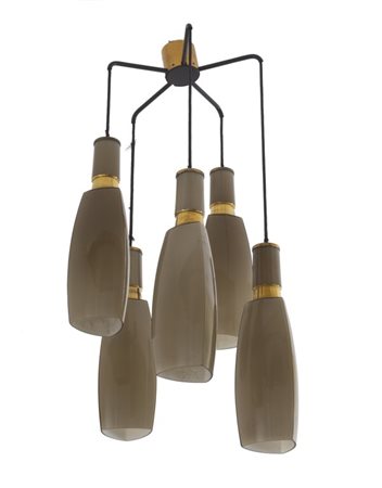STILNOVO Un lampadario , anni '60. Ottone, vetro incamiciato. Etichette...
