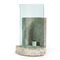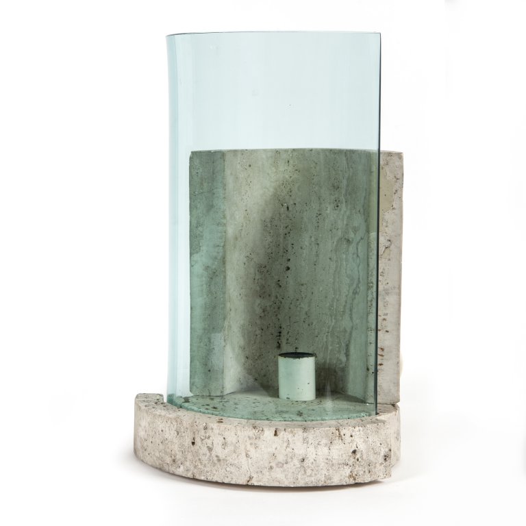 Travertino, cristallo curvato.