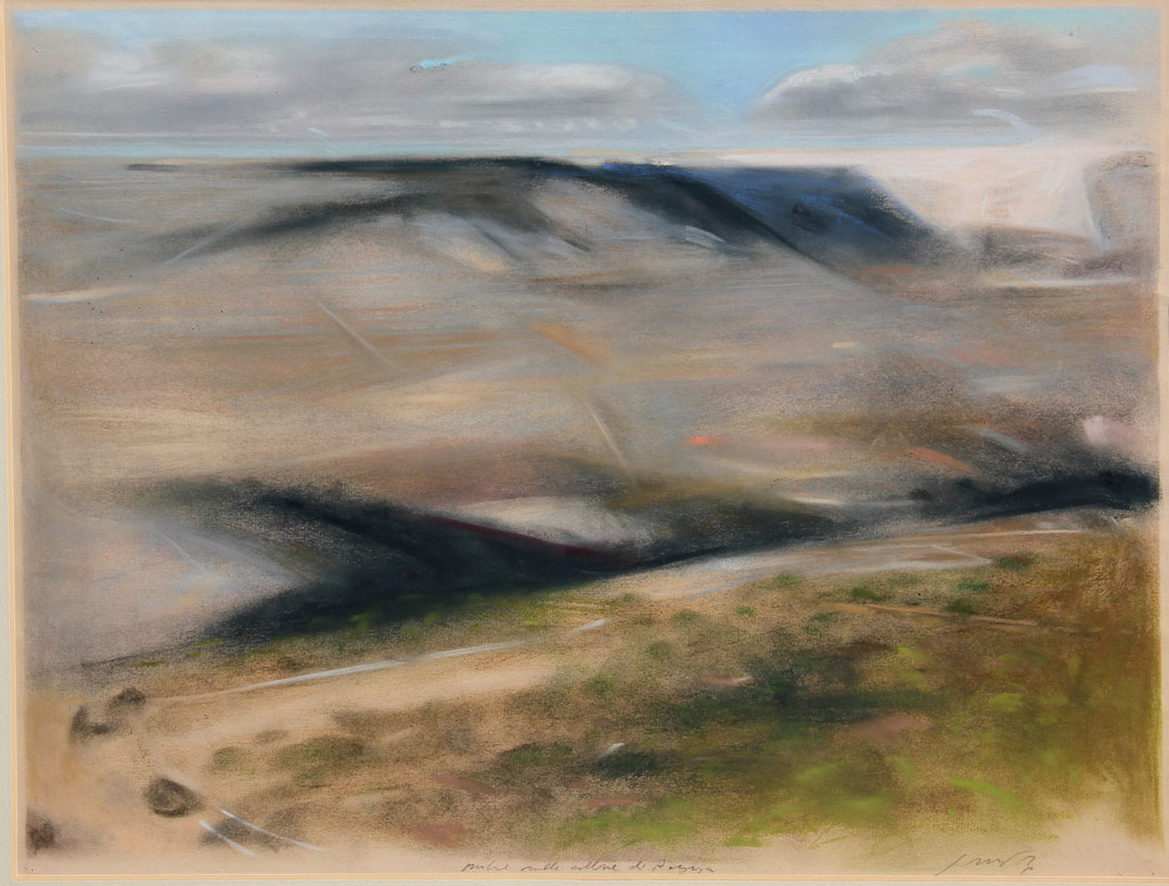 Piero GUCCIONE Scicli 1935 Ombre sulla collina di Ragusa, 1983, pastelli su cartoncino, cm. 50 x 64, R. Tassi, 'Piero Guccione 1983-1987', Galleria La Sanseverina Edizioni d'Arte, 1988, copertina, Titolo 'Ombre sulla collina di Ragusa' (in basso al centro); #firma 'Guccione' (in basso a destra)