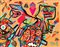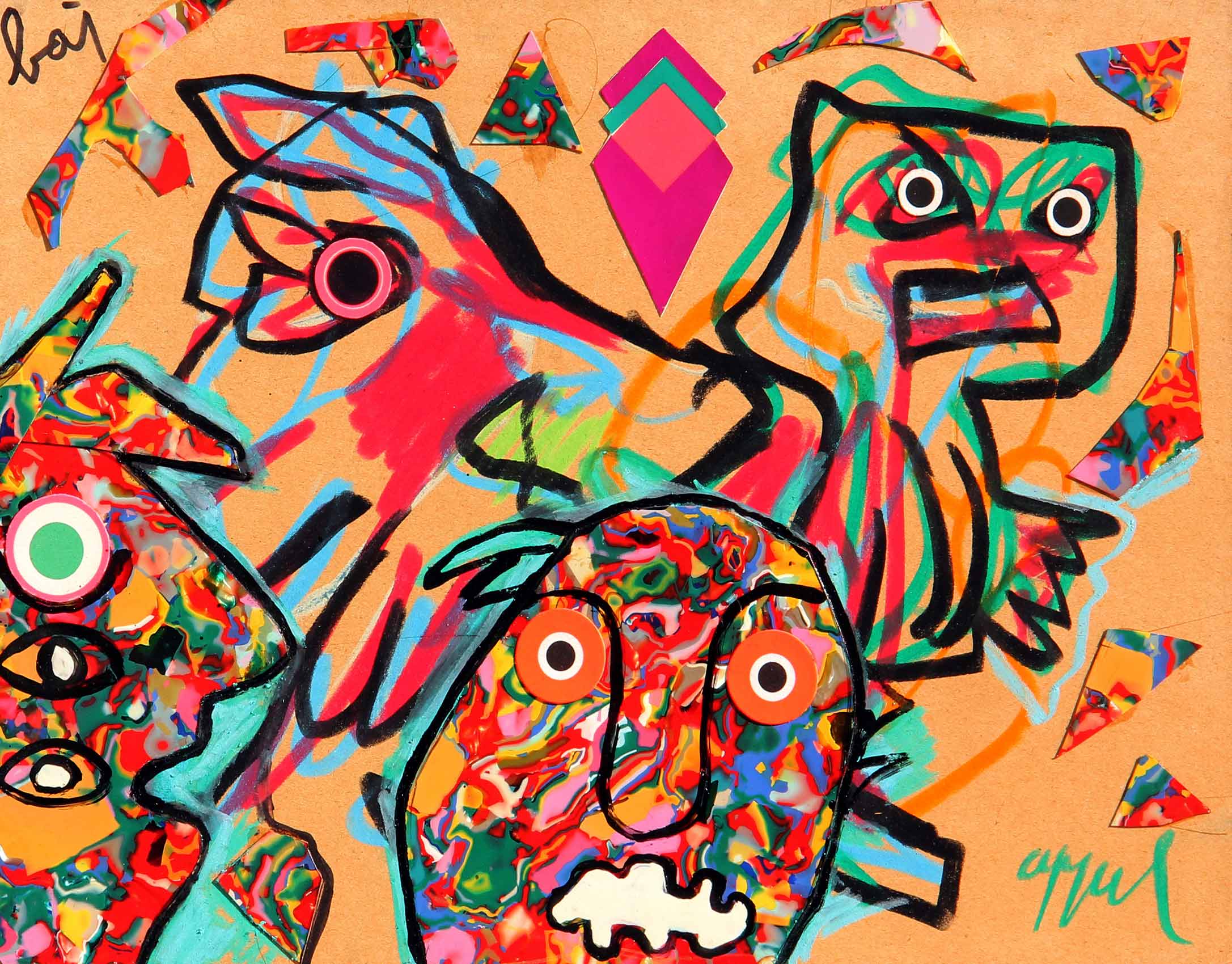 APPEL Karel e BAJ Enrico Figure, 1982, pittura e collage su tavola, cm. 36 x 48, Firma 'Baj' (in alto a sinistra); #firma 'Appel' (in basso a destra) #Dedica, firme, data 'Appel, Baj, 03 Dec 1982'; #timbro della galleria d'arte Rinaldo Rotta, Genova (al retro) Provenienza della Galleria Rinaldo Rotta, Genova