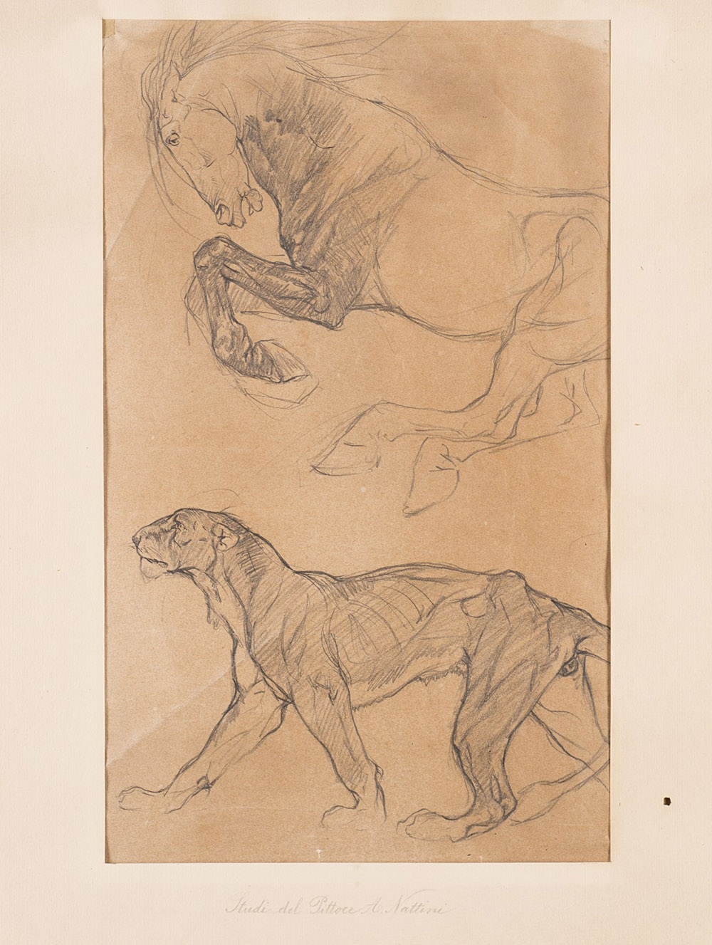 Amos Nattini (Genova 1892 - Parma 1985) (Attribuito) Studio per animali "Cavallo" "Tigre" disegno su carta (cm 39.5x24) In cornice