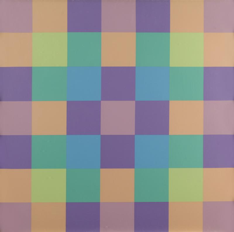 PAOLO MINOLI (Cantù (CO) 1942) Compenetrazioni reticolari e loro risultanze 1974 acrilico su tela cm 70x70 firmato e titolato sul retro pubblicato sull'invito della mostra"Poetica della luce" Galleria Valente Finale Ligure etichetta Galleria d'Arte Valente Finale Ligure