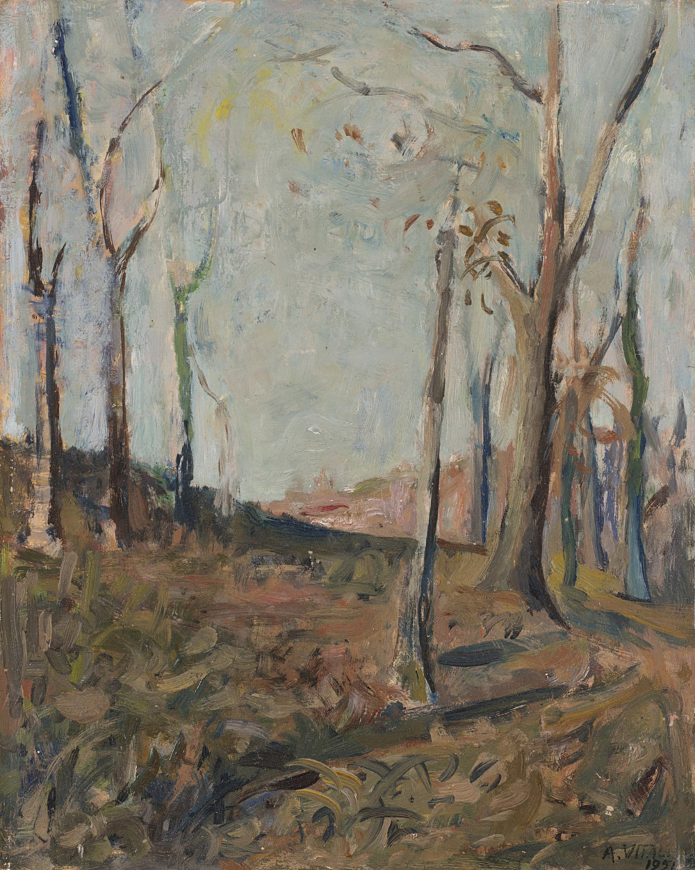 Alberto Vitali (Bergamo 1898 - 1974) "Paesaggio" 1951 olio su tavola (cm 50.5x40.5) Firmato e datato in basso a destra Al retro: firmato, titolato e datato; timbri e cartigli Provenienza: Galleria d'Arte San Marco, Bergamo. Timbri e cartiglio; Galleria del Colleoni Bergamo. Cartiglio al retro In cornice