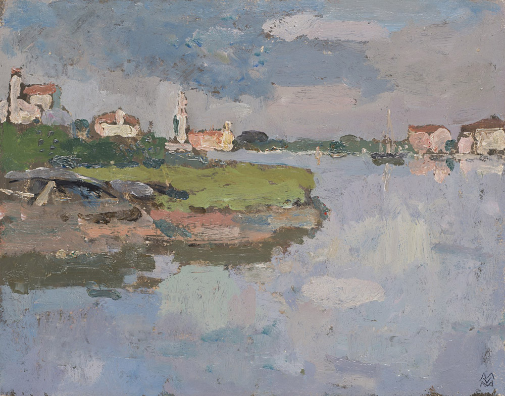 Mario Vellani Marchi (Modena 1895 - Milano 1979) "Estate a Mazzorbo" 1930 olio su cartone (cm 23.5x30) Siglato in basso a destra Al retro: firmato, titolato, datato e locato Burano; cartiglio e timbri Provenienza: Galleria d'Arte Ponte Rosso, Milano. Cartiglio e timbri In cornice