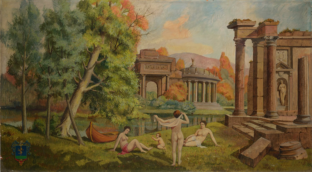 Arnaldo Ronchi (Laino (Co) 1898 - Milano 1985) "Il bagno sulla riva" 1957 olio su masonite (cm 100x180) Firmato e datato in basso a destra In cornice