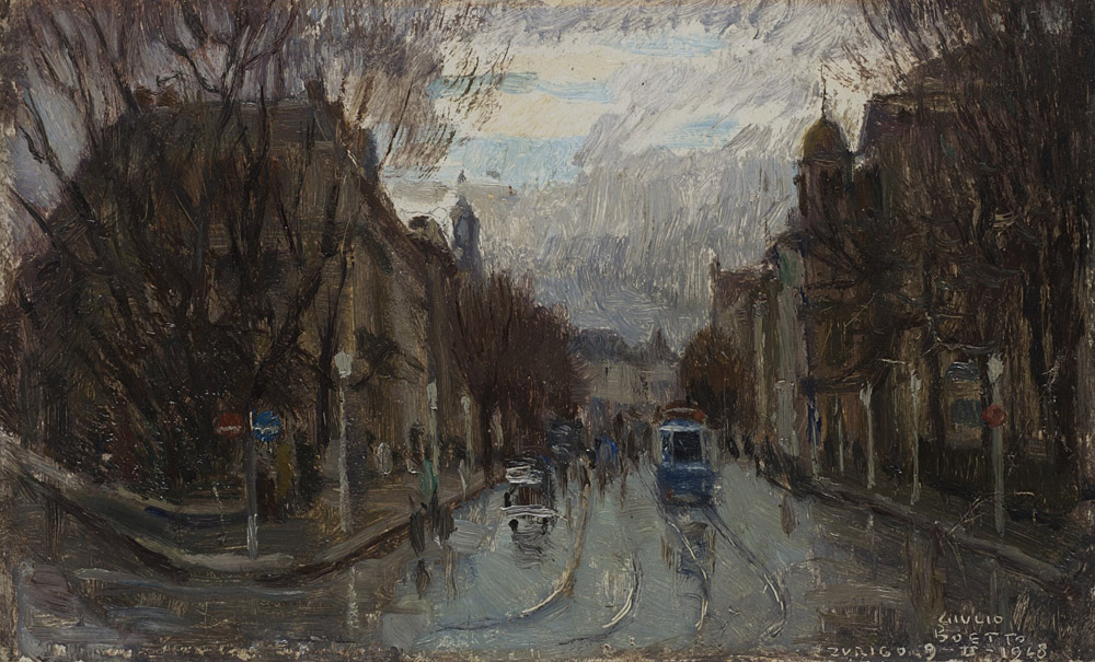 Giulio Boetto (Torino 1894 - 1967) "Bahnohfstrasse. Zurigo" 1948 olio su cartone (cm 15.5x25.5) Firmato, datato e locato in basso a destra Al retro: cartiglio Provenienza: Galleria Fogliato, Milano. Cartiglio In cornice