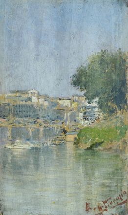 Natale Attanasio (Catania, 1846 - Roma, 1923) LUNGO TEVERE Olio su tavola, cm. 17,3x10,5 Firma in basso a destra e sul verso.