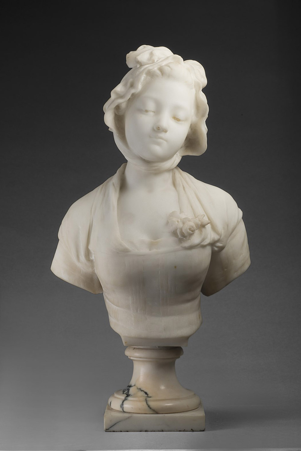 Pierre Antoine Laurent (Montlucon 1868 - 0) "Gentildonna" mezzo busto in marmo (h cm 42) poggiante su base in marmo tornito Firmata sul fianco destro