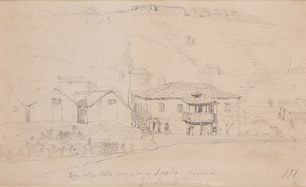Gerolamo Induno (Milano 1825 - 1890) "Casa dello Stato Maggiore Sardo - Crimea" disegno a matita su carta (cm 13.9x23.5) Firmato ed iscritto in basso al centro; numerato 131 in basso a destra * Per la scheda completa consultare il catalogo cartaceo