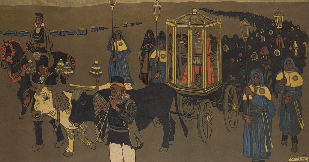 Giuseppe Biasi da Teulada (Sassari 1885 - Andorno Micca (BI) 1945) "Festa patronale sarda" litografia (cm 47x88) Firmata, locata Cagliari e numerata 32/125 in basso a destra In cornice