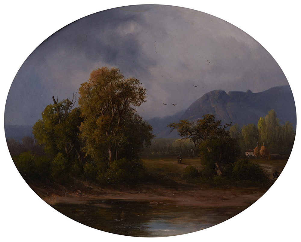 Scuola del XIX Secolo "Paesaggio" olio su cartone ovale (cm 22x26.5) Siglato A.G. in basso a destra In cornice