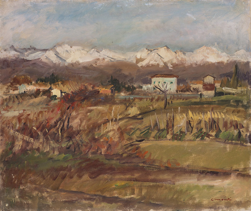 Cesare Monti (Brescia 1891 - Bellano 1959) "Paesaggio d'autunno" olio su tela (cm 50x60) Firmato in basso a destra Al retro: cartiglio e timbri Provenienza: Galleria d'Arte Ponte Rosso, Milano. Cartiglio