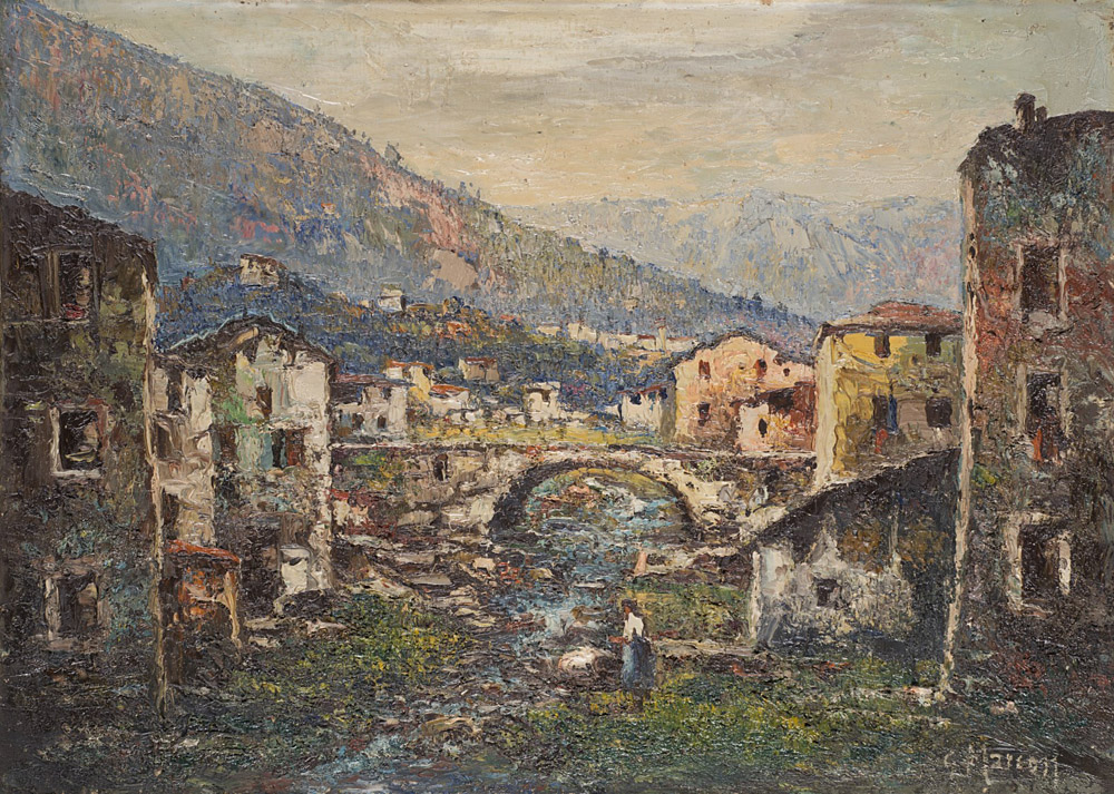 Giorgio Marcon (Venezia 1924 - 0) "Val Brembana. Olmo" olio su tela (cm 49.5x70) Firmato in basso a destra Al retro: titolato In cornice
