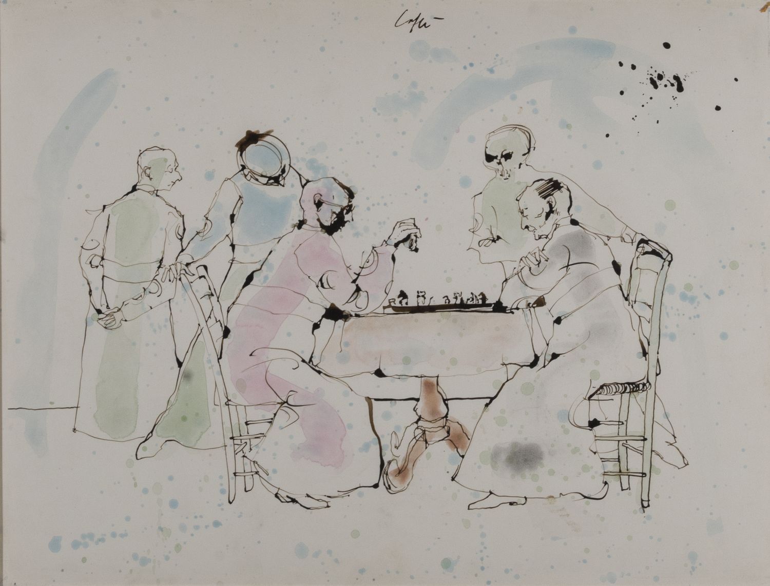 Nino Caffè (1909-1975) Pretini che giocando a scacchi firma in alto al centro...