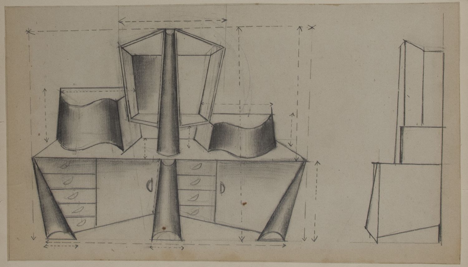 Fortunato Depero (1892-1960) Cassettiera con specchi matita su carta cm 26,6x47,7 eseguito nel 1926-1927 Opera registrata nel Catalogo Generale Ragionato delle Opere dell’Artista con n. FD-4085-DIS Il disegno rientra nel gruppo di progetti per i mobili dell’abitazione dell’artista, alcuni dei quali effettivamente eseguiti.