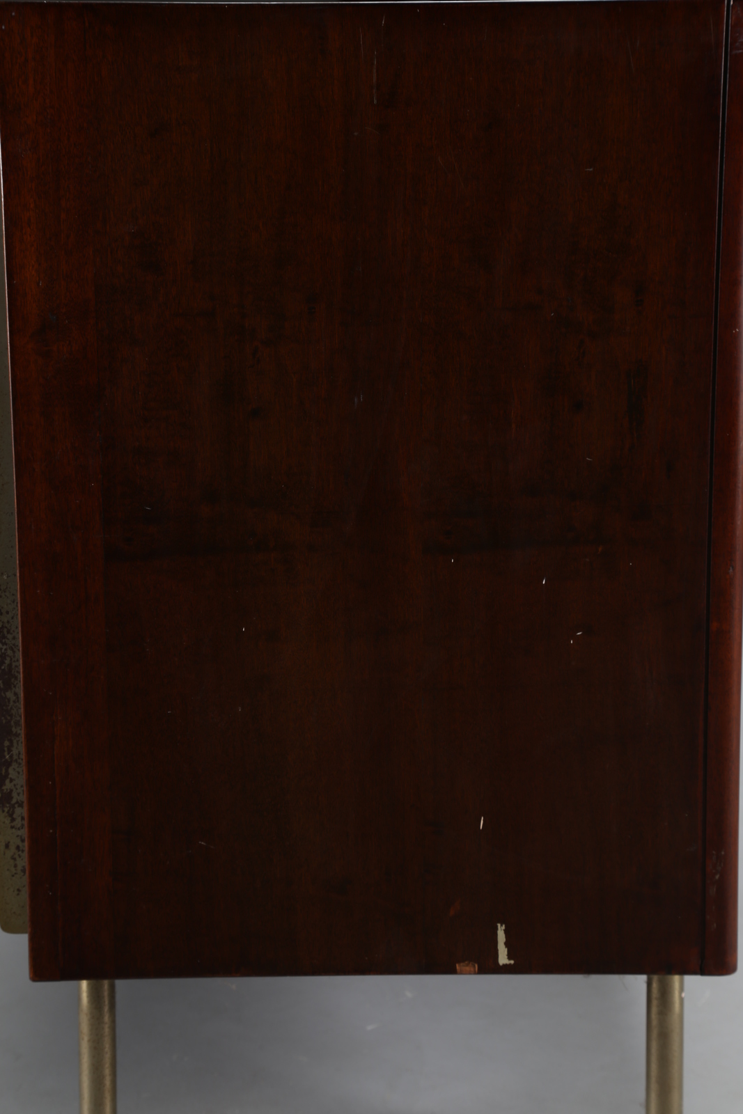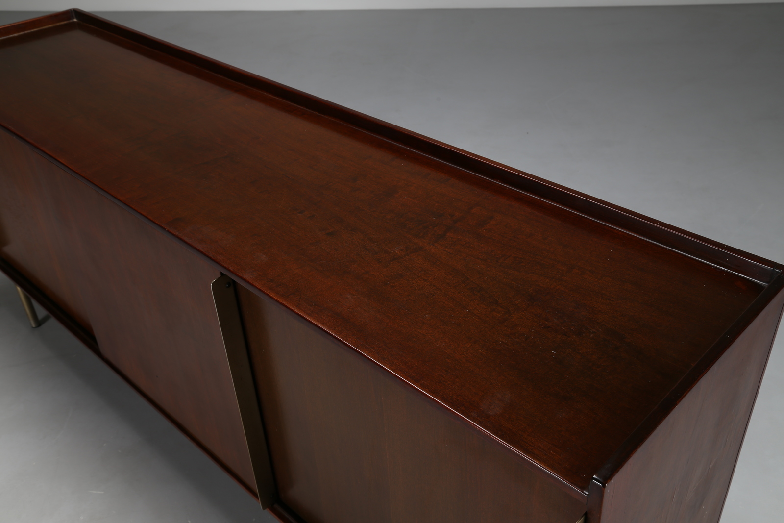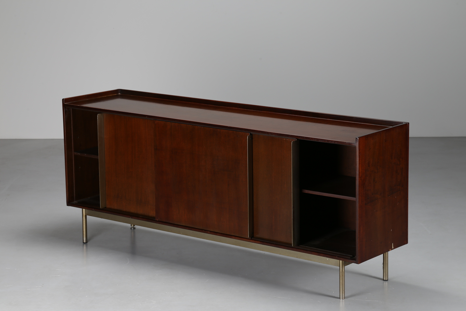 RINALDI GASTONE Mobile in paniforte impiallaciato palissandro, tre ante scorrevoli, gambe in tubo d'acciaio, 1955 Bib. Gastone Rinaldi designer alla Rima a cura di Giuseppe e Jacopo Drago Pag. 218 . Legno di noce. Cm 190,50 x 80,00 x 45,00. anni 50
