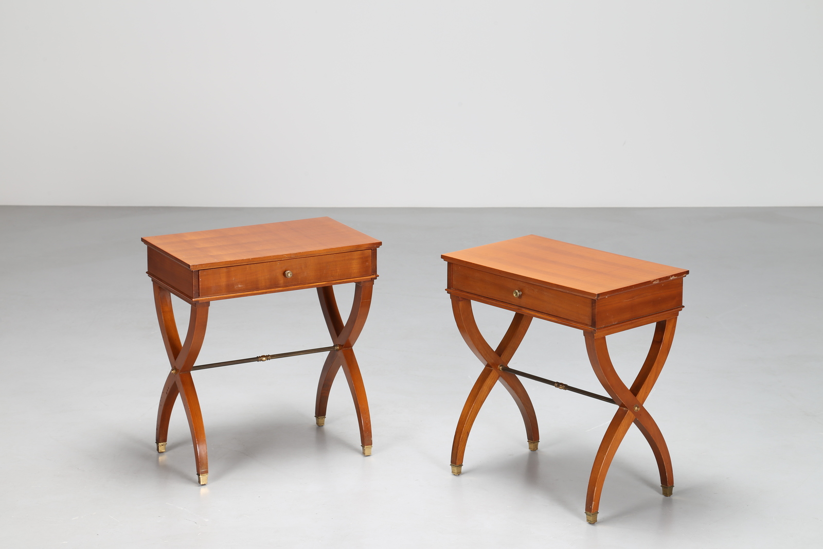 BUFFA PAOLO (1903 - 1970) Coppia comodini in noce caucasico e ottone per Serafino Arrighi, 1950. Legno e ottone. Cm 50,00 x 55,00 x 31,00.