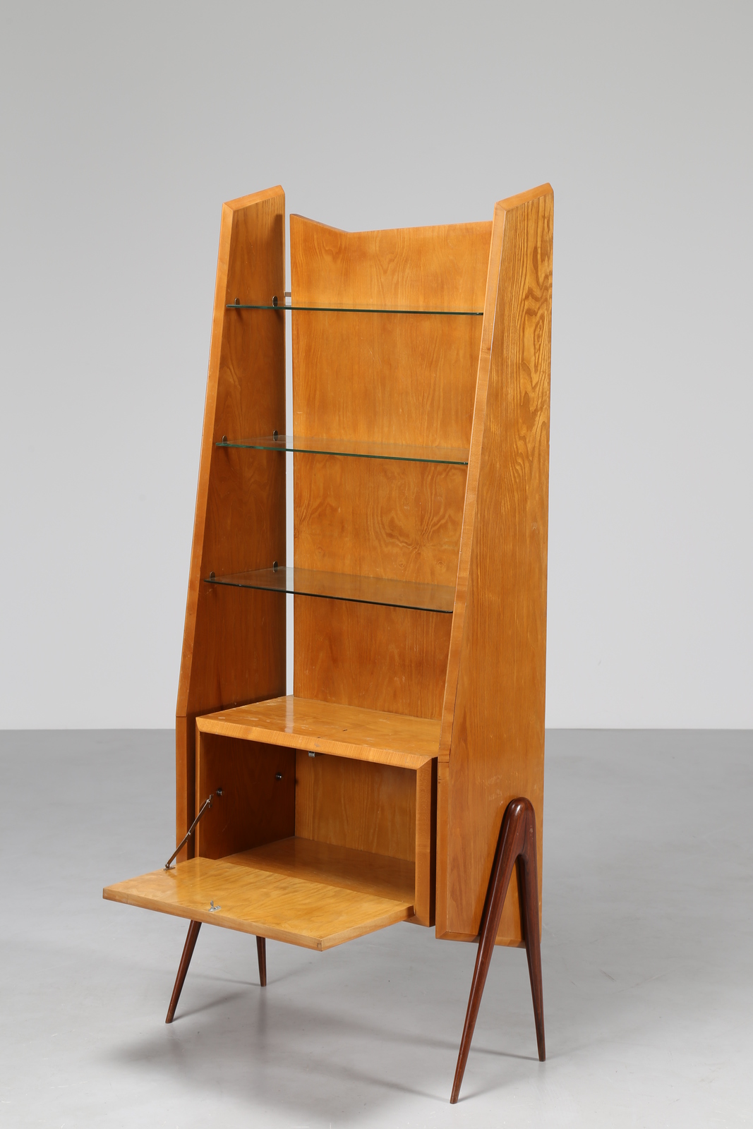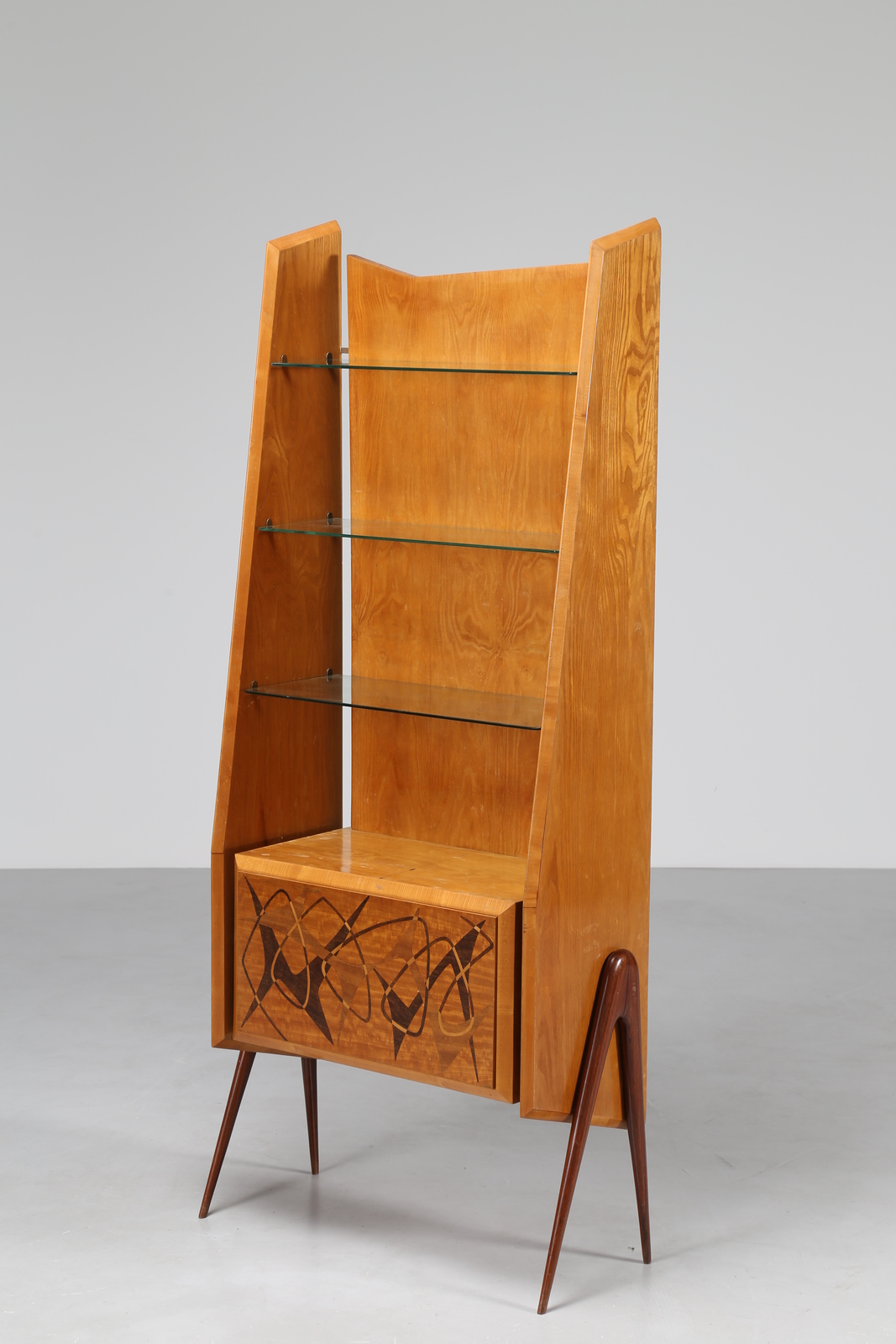 SCREMIN LUIGI Mobile da soggiorno con intarsi di Marino Meo, Fratelli Scremin, 1950. Legno e vetro. Cm 80,00 x 186,00 x 36,00.