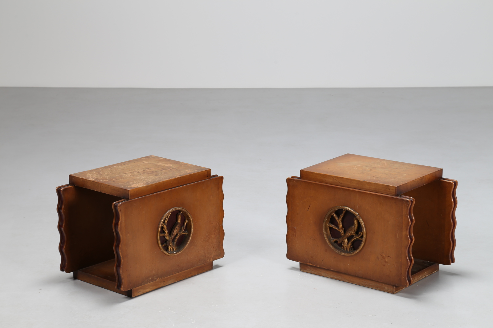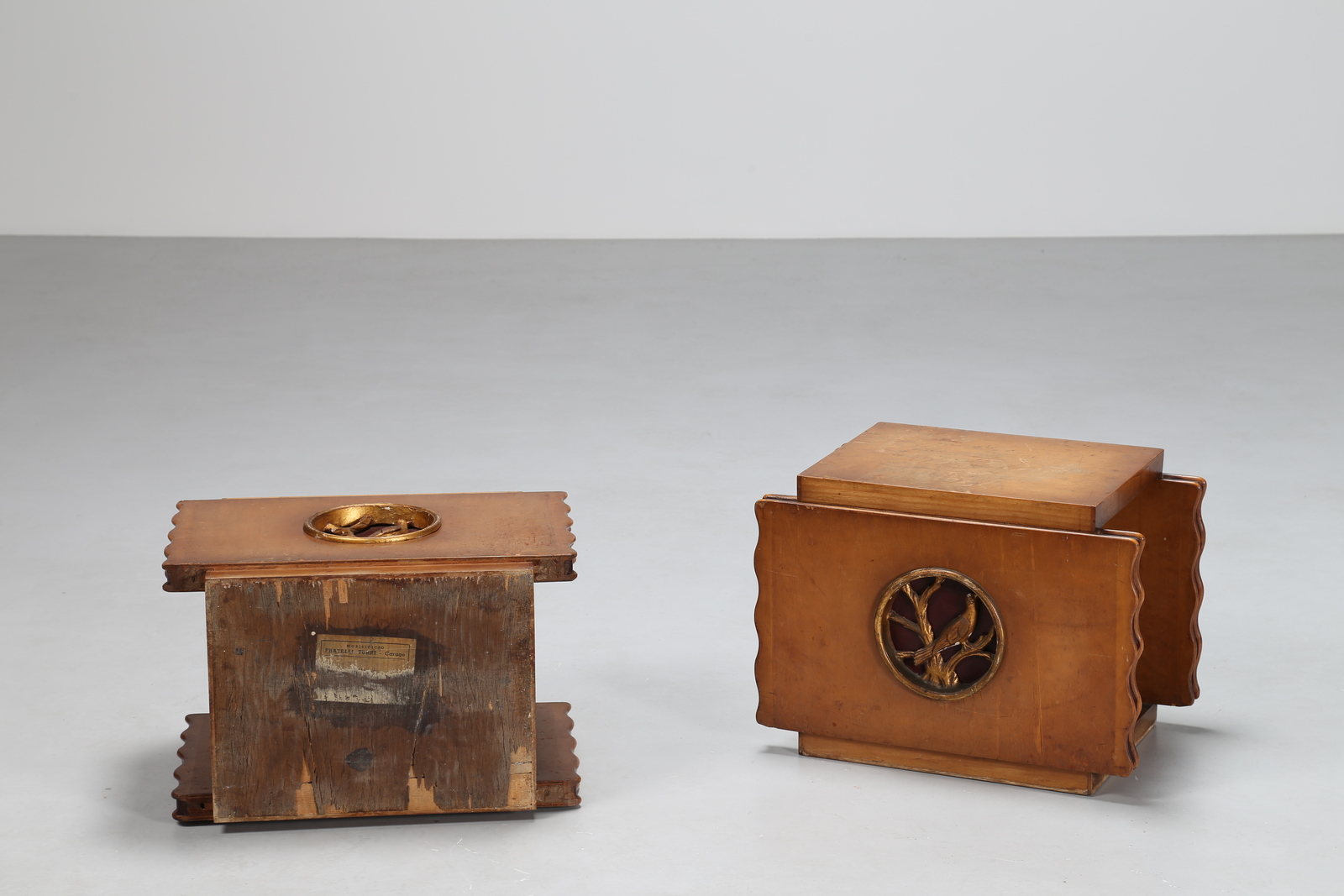 MONTUORI EUGENIO Attrib. Coppia sgabelli in legno di frassino con intaglio centrale figurante uccello. Legno. Cm 52,00 x 39,00 x 33,00. anni 40