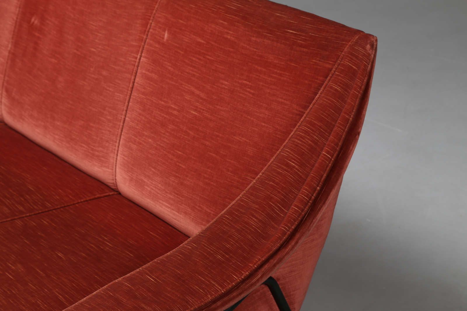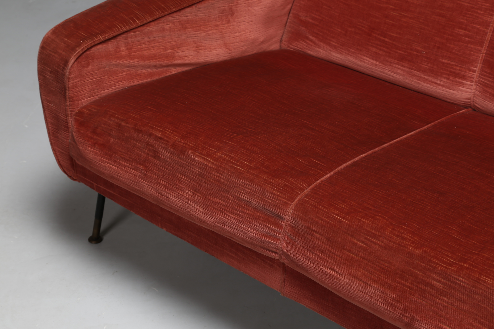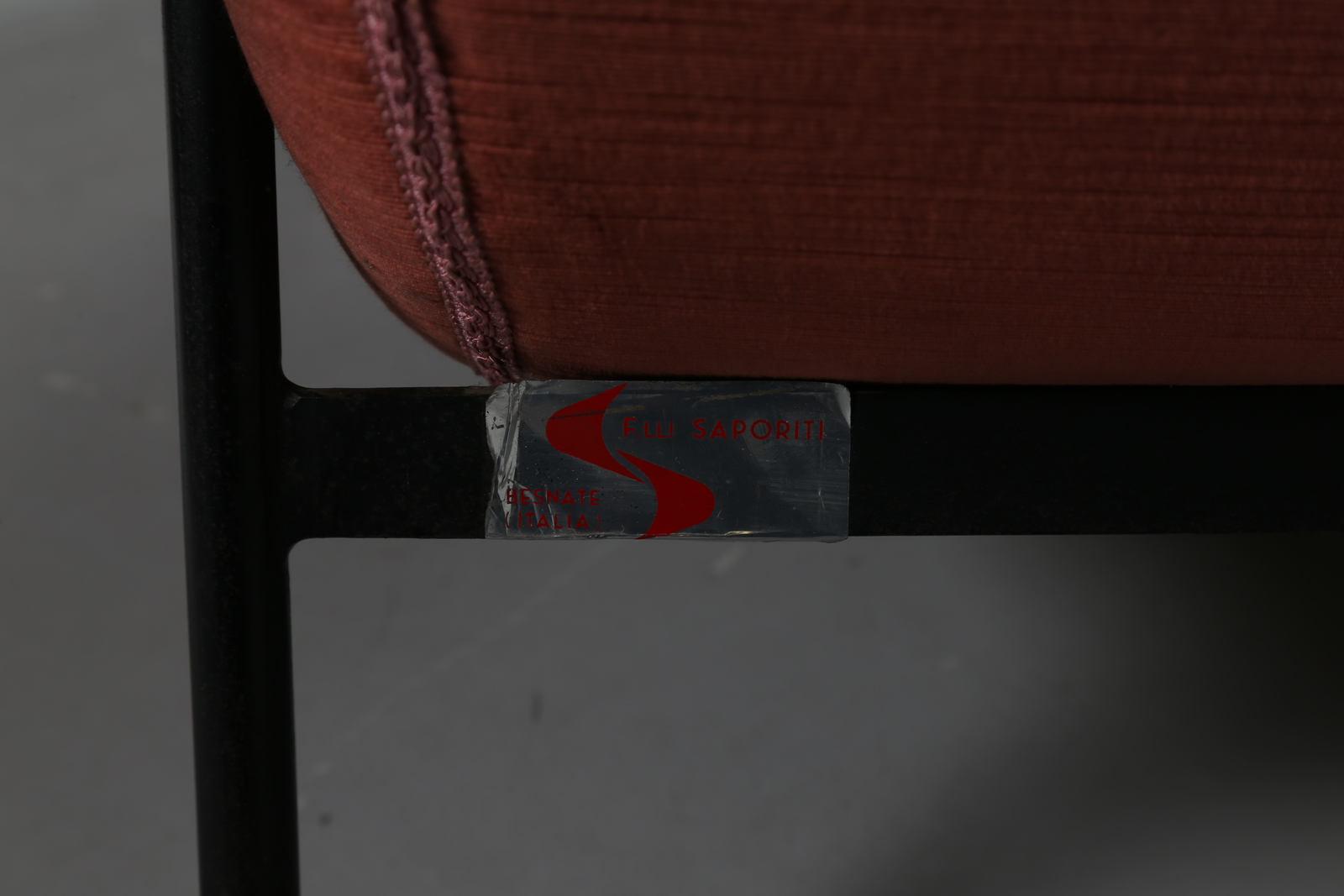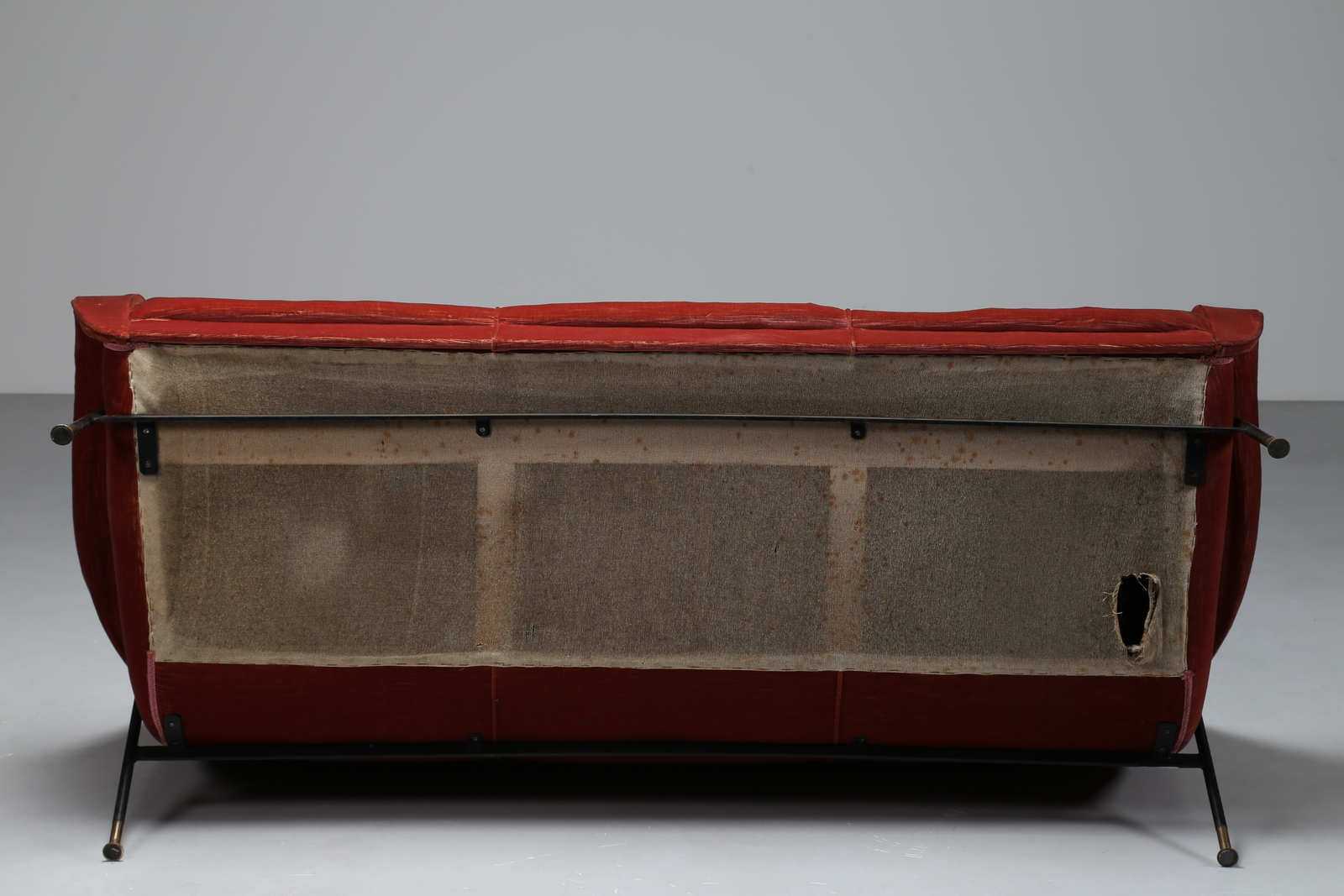 BOZZI AUGUSTO (1924 - 1982) Divano tre posti con struttura in metallo nero, per Fratelli Saporiti, 1954, etichetta presente su metallo. Tessuto,metallo laccato e ottone. Cm 185,00 x 76,00 x 88,00. anni 50