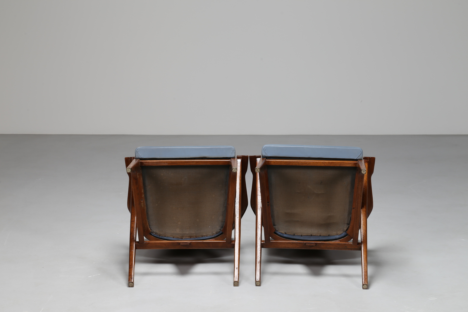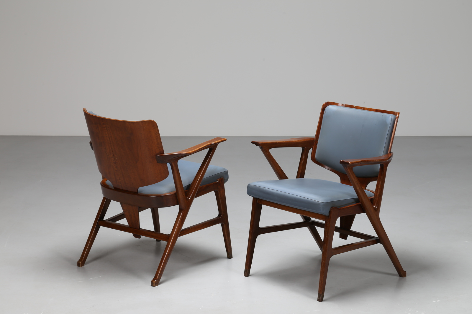 CIUTI ENRICO (n. 1910) Due poltroncine realizzate nella breve collaborazione con Figli di Amedeo Cassina tra il 1948/55 fancenti parte di un albergo termale del centro Italia. Presente etichetta. Legno di noce e skai. Cm 61,00 x 75,50 x 58,00. anni 50