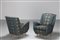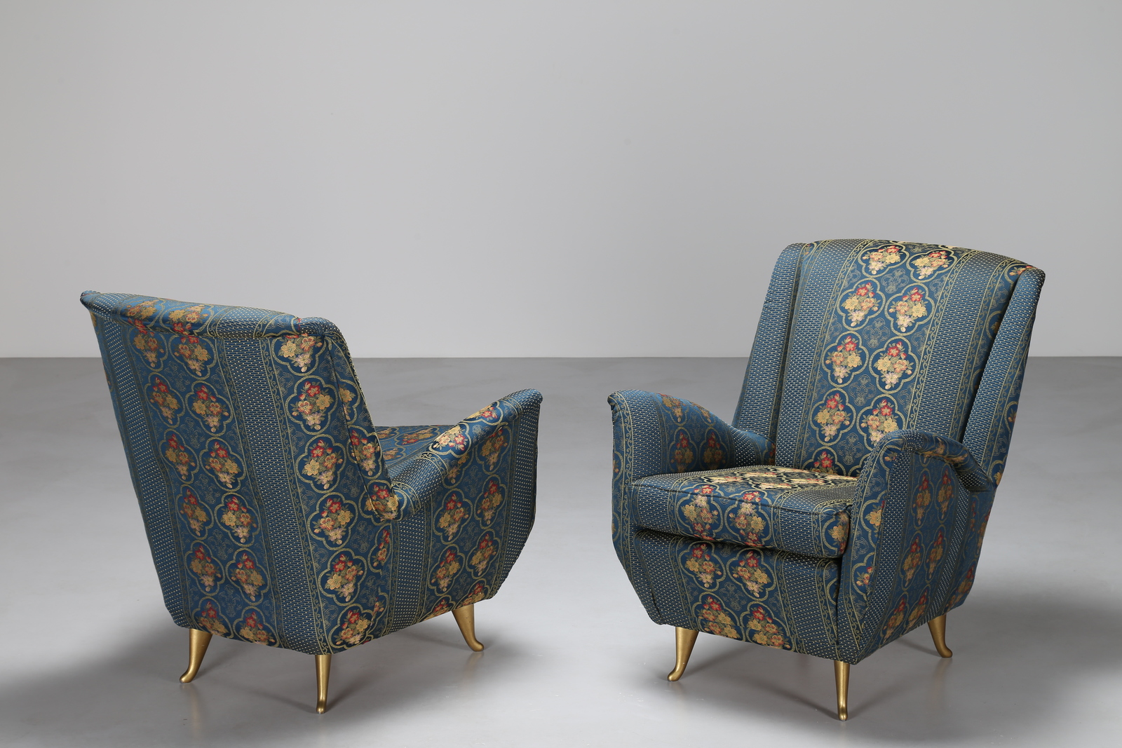 I.S.A. Coppia di poltrone, piedini in ottone e tessuto . Ottone e tessuto. Cm 80,00 x 90,00 x 95,00. Anni '50.