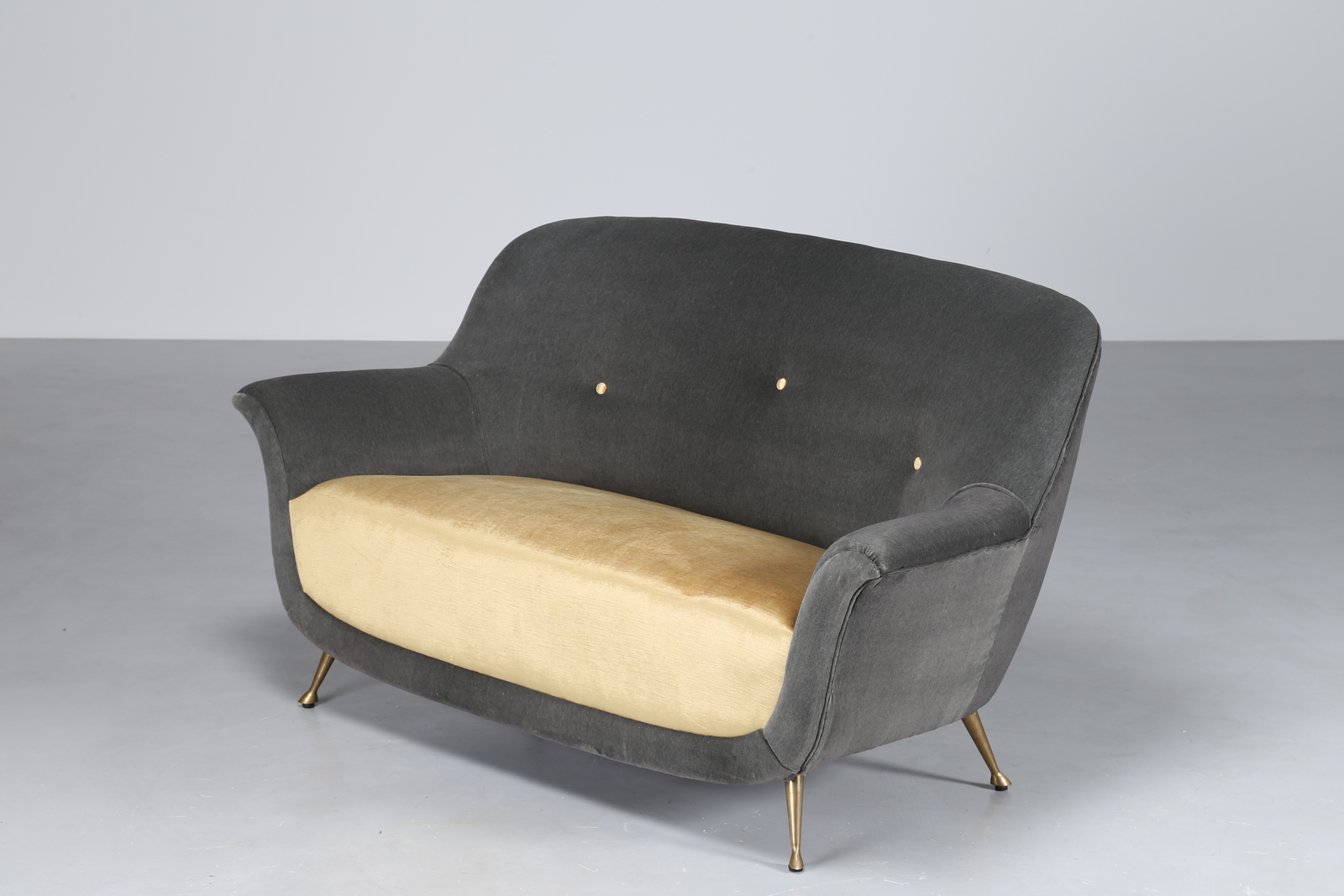 ISA BERGAMO Divano due posti in velluto e piedini in ottone, 1950. tessuto e...