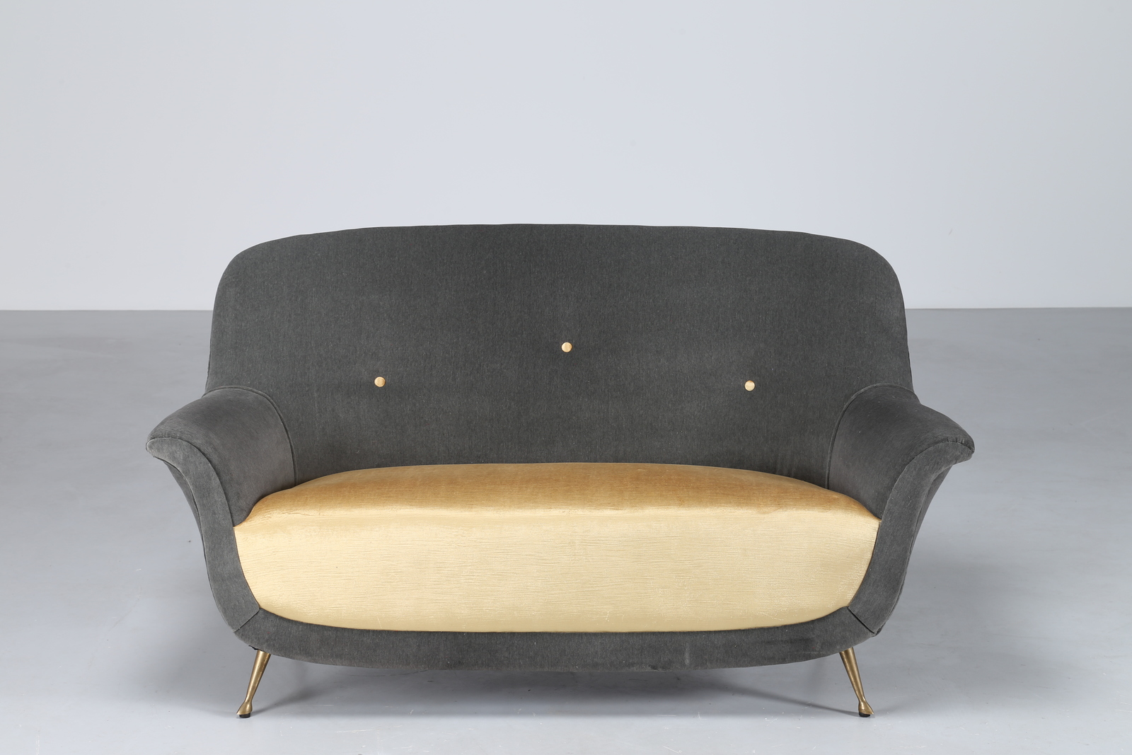 ISA BERGAMO Divano due posti in velluto e piedini in ottone, 1950. tessuto e ottone. Cm 150,00 x 80,00 x 78,00.