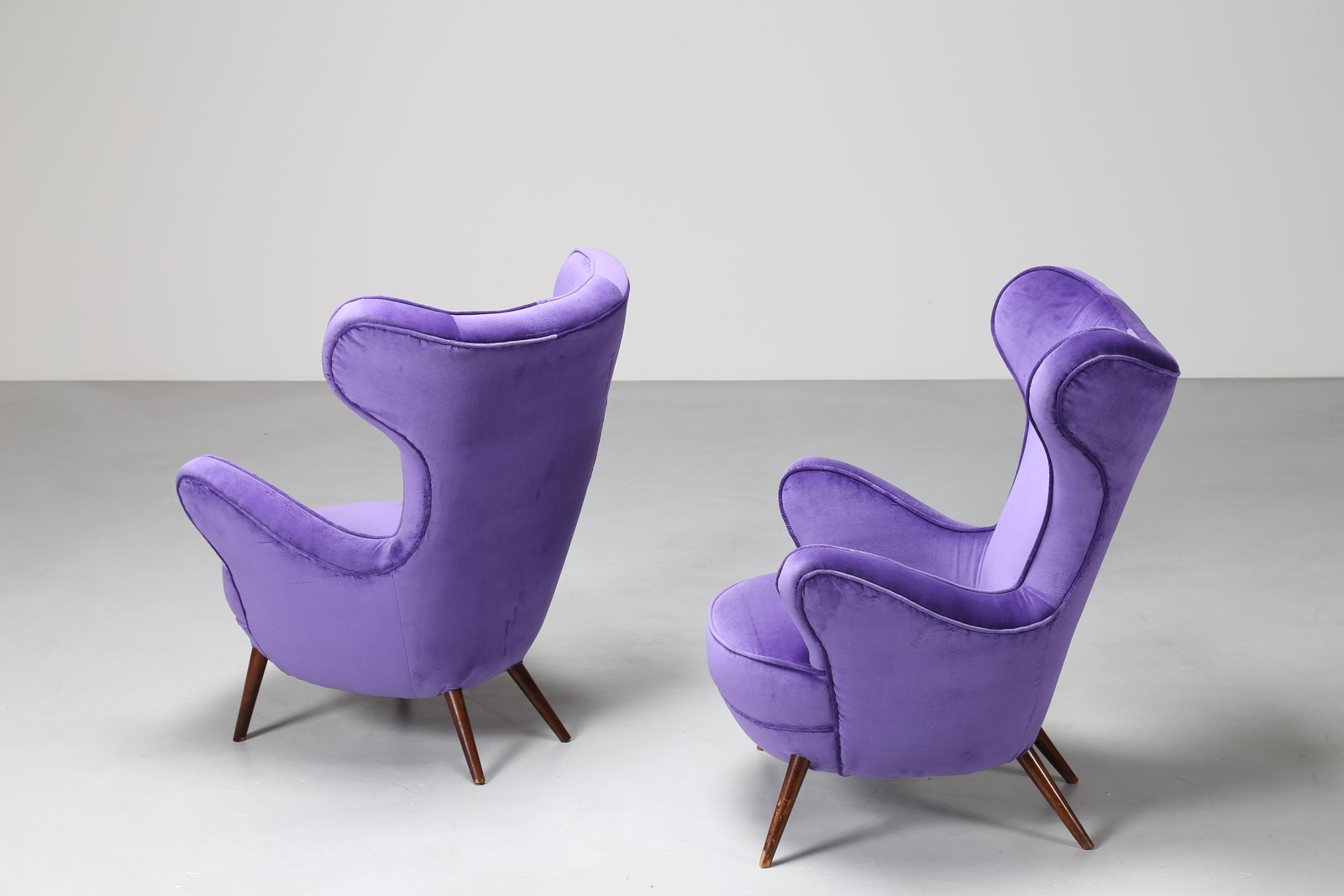 MALCHIODI PAOLO Coppia poltrone legno e velluto, 1950 Bib. Esempi di arredamento moderno di R. Aloi, ed. Ulrico Hoepli MI fig. 194 . Tessuto e legno. Cm 70,00 x 94,00 x 74,00. anni 50