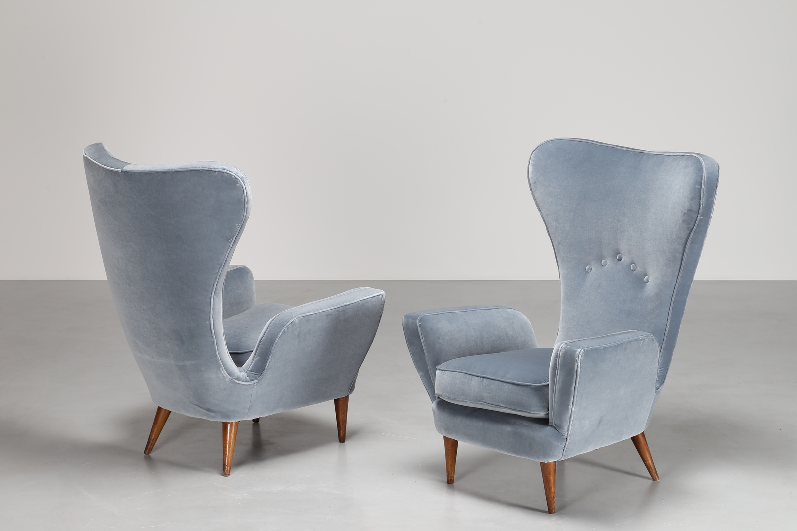 EMILIO SALA E GIORGIO MADINI Coppia poltrone in tessuto e legno, prod. Fratelli Galimberti Cantù, 1950. Bib. La rivista dell'arredamento n. 90, pag. 20, 1962 Gorlich Editore Milano . Tessuto e legno. Cm 73,00 x 99,00 x 80,00.