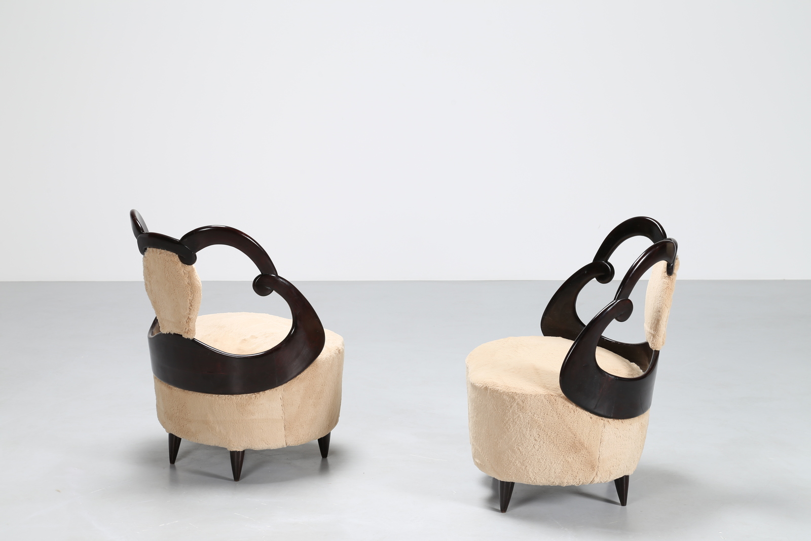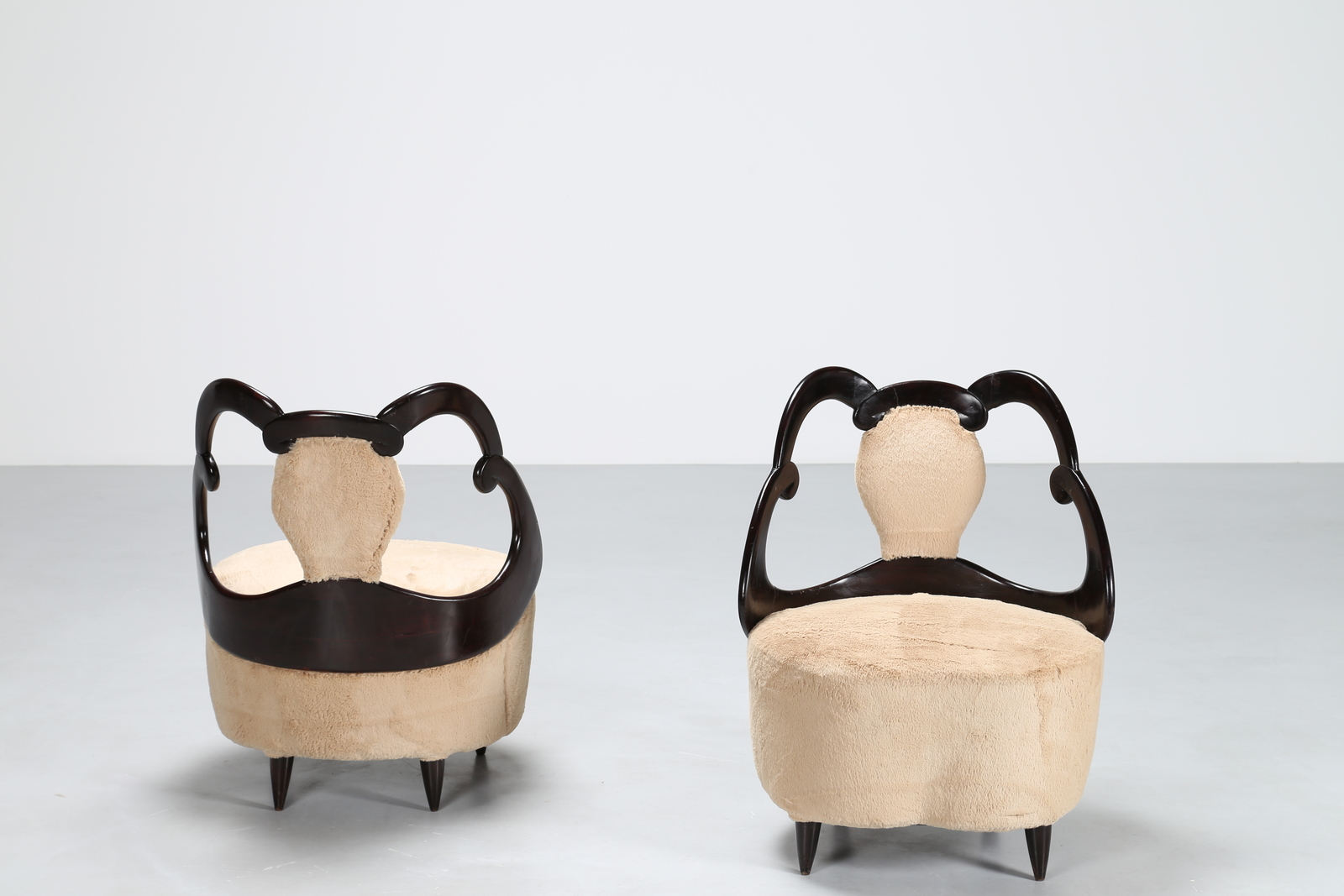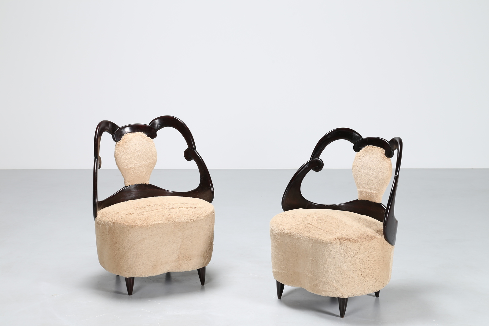 MANIFATTURA ITALIANA Coppia poltroncine in legno ebanizzato e velluto per camera da letto, 1940 . Tessuto e legno. Cm 63,00 x 78,00 x 60,00. anni 50