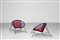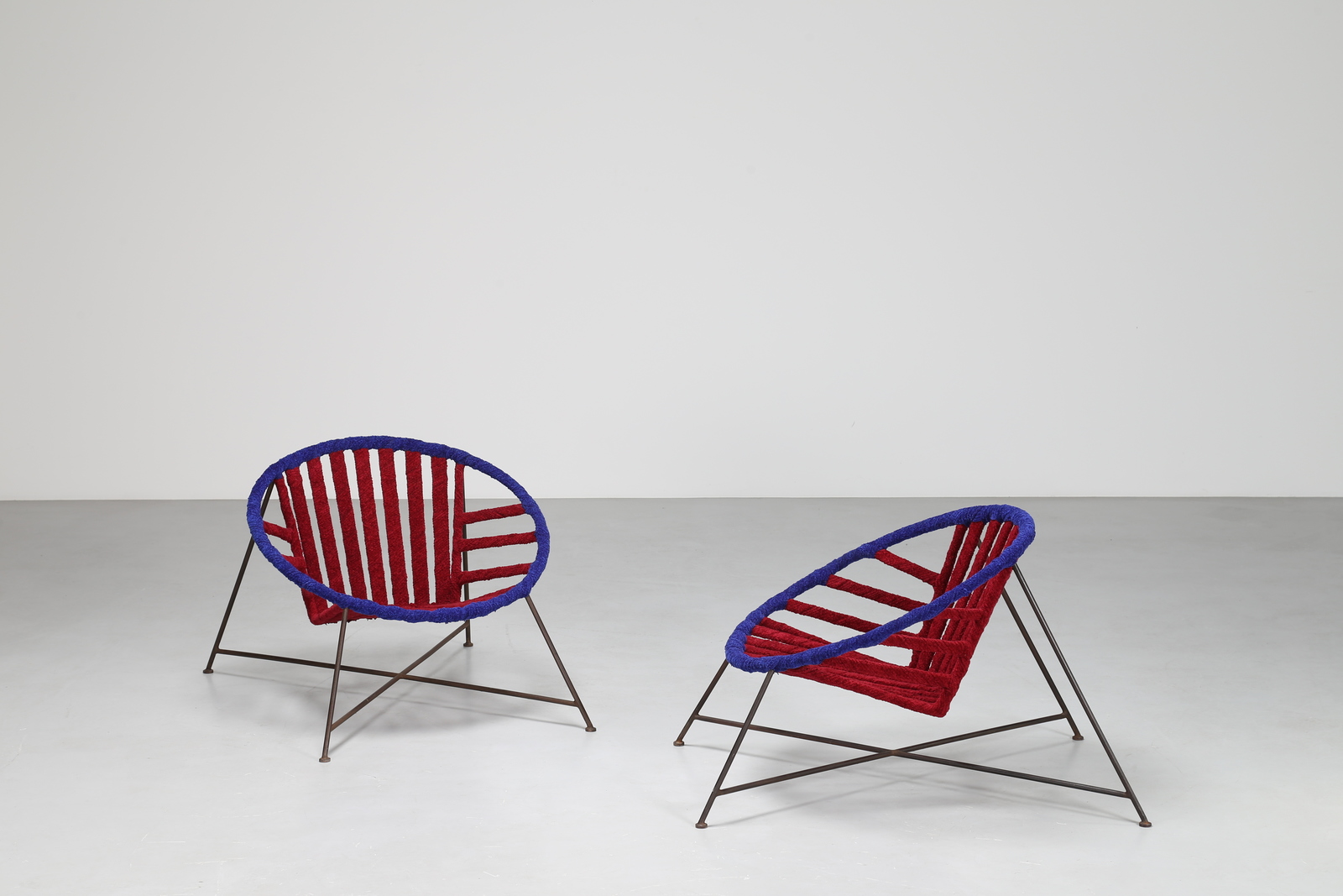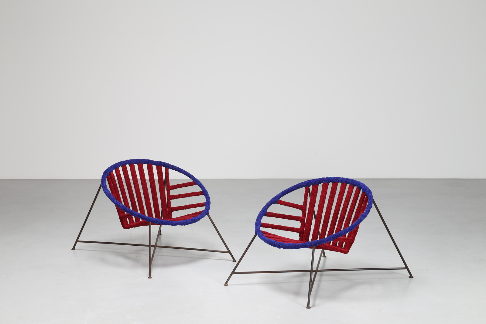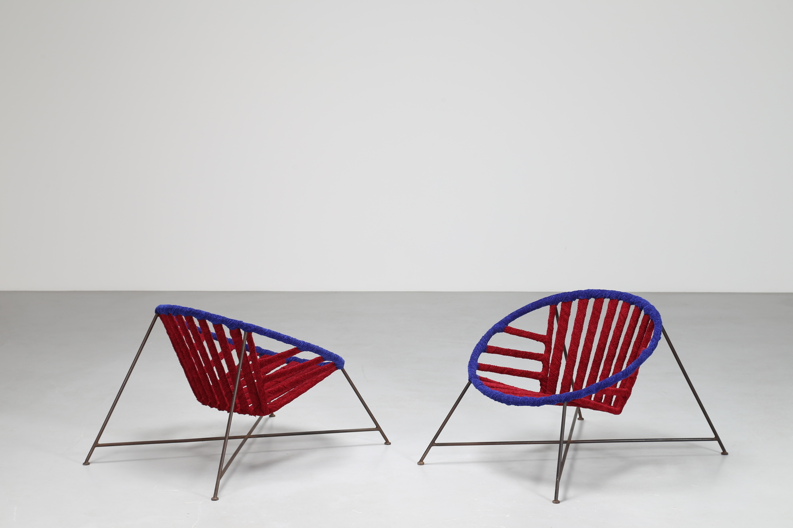 TEMPESTINI MAURIZIO (1908 - 1960) Coppia poltrone "cesta" in velluto rosso e blu con struttura tondino di ferro produzione Ditta John B. Salterini di New York. Tessuto e metallo. Cm 70,50 x 58,50 x 92,50. anni 60