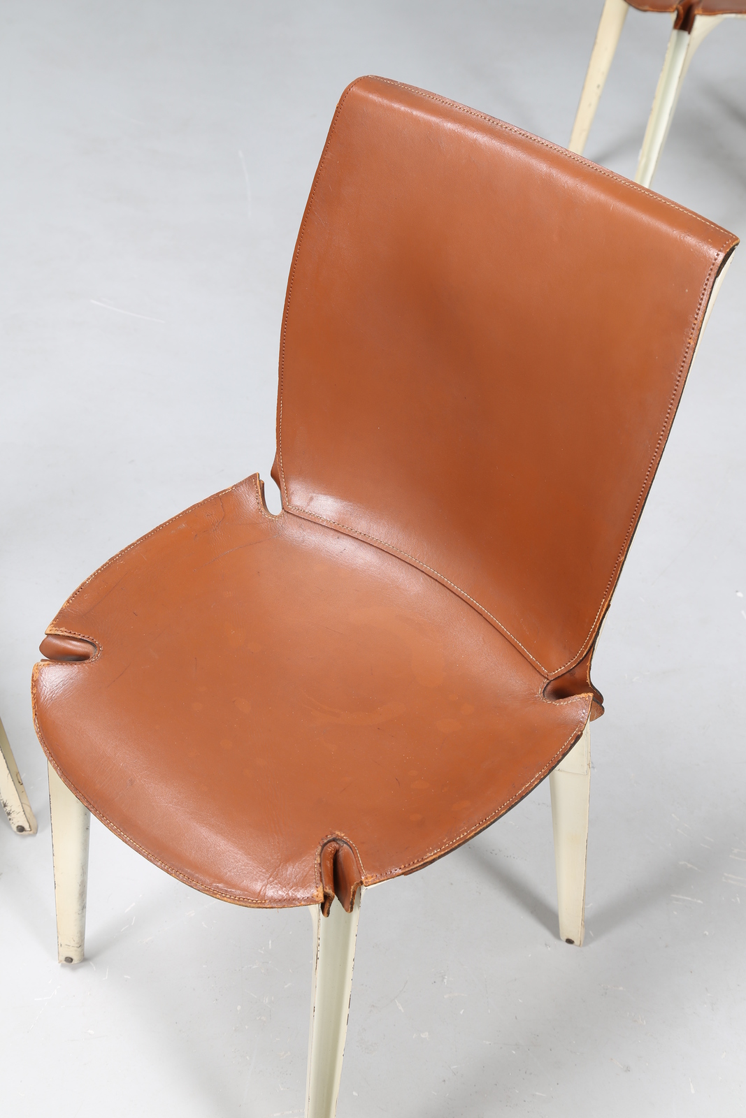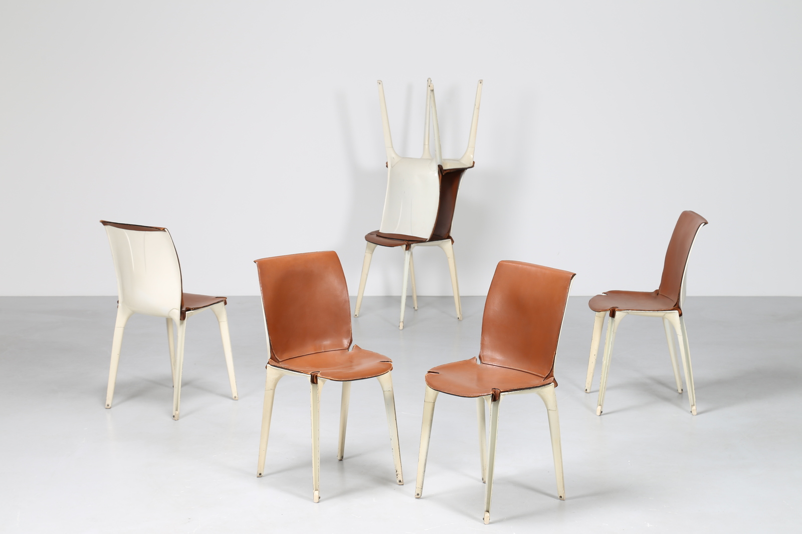 ZANUSO MARCO (1916 - 2001) Sei sedie in metallo laccato bianco e cuoio modello “lambda” in lamiera di acciaio stampata e verniciata a fuoco, Prod. Gavina, Italia 1964. Bib. François Burkhardt, Marco Zanuso, Federico Motta Editore, Milano 1994, pp. 92-97; Manolo De Giorgi, Marco Zanuso architetto, Skira, Milano 1999, pp. 96-99. . Metallo laccato e cuoio. Cm 39,00 x 79,00 x 41,00. anni 60