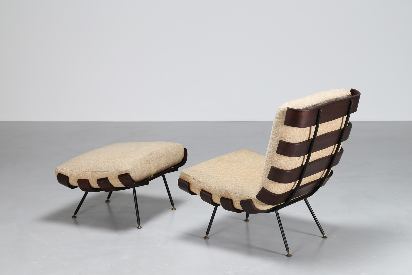 CARLO HAUNER (1927-1997) & MARTIN HESLER (1913-1977) Poltrona e una panchetto in ferro verniciato e compensato curvato di teak con cuscini mobili, per FORMA, 1960. Bib. Domus 362 (gennaio 1960), pubblicità. . Legno, metallo e tessuto. Cm 70,50 x 87,00 x 82,00. Panchetto misura: 41x70,5x55