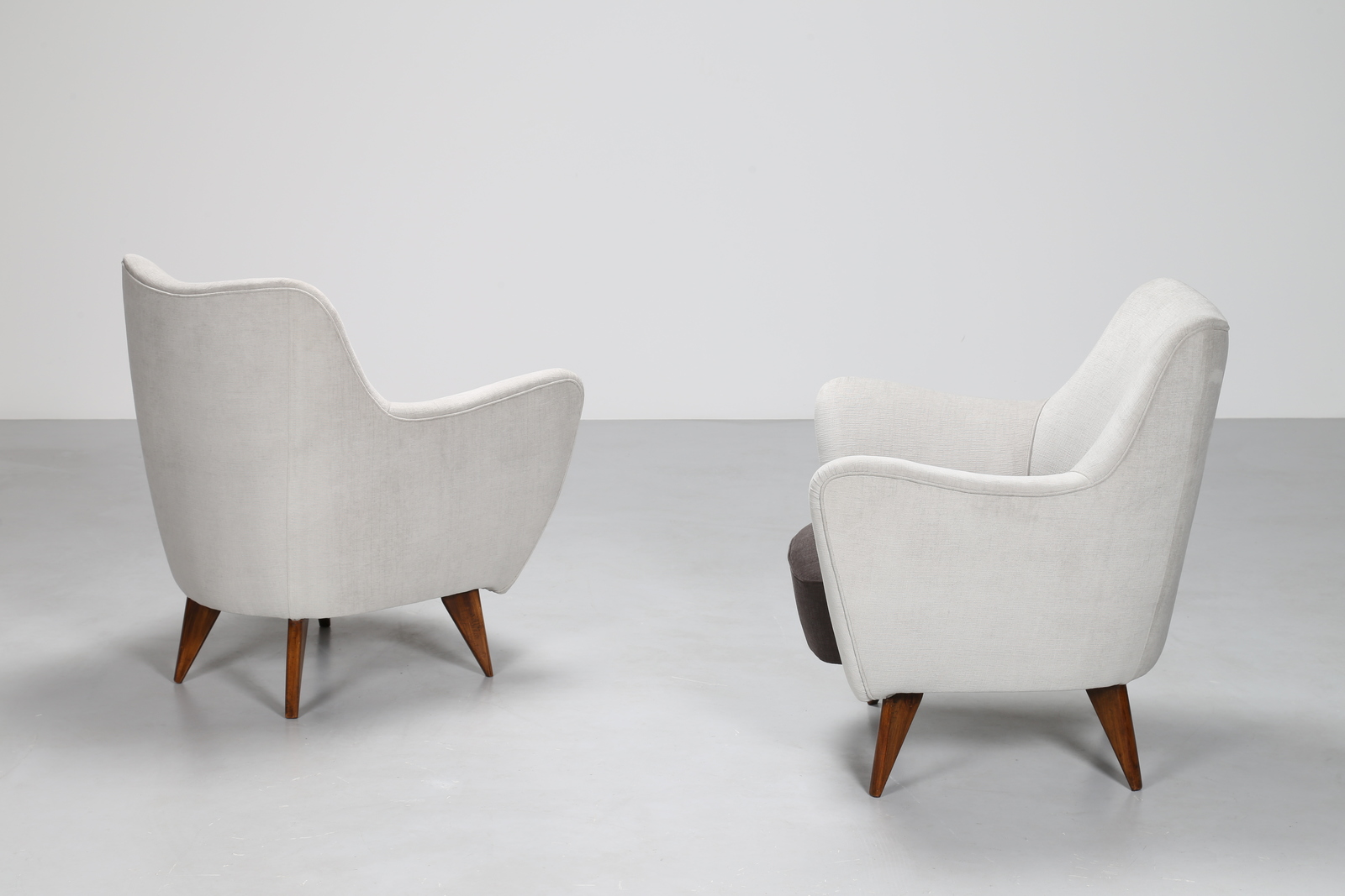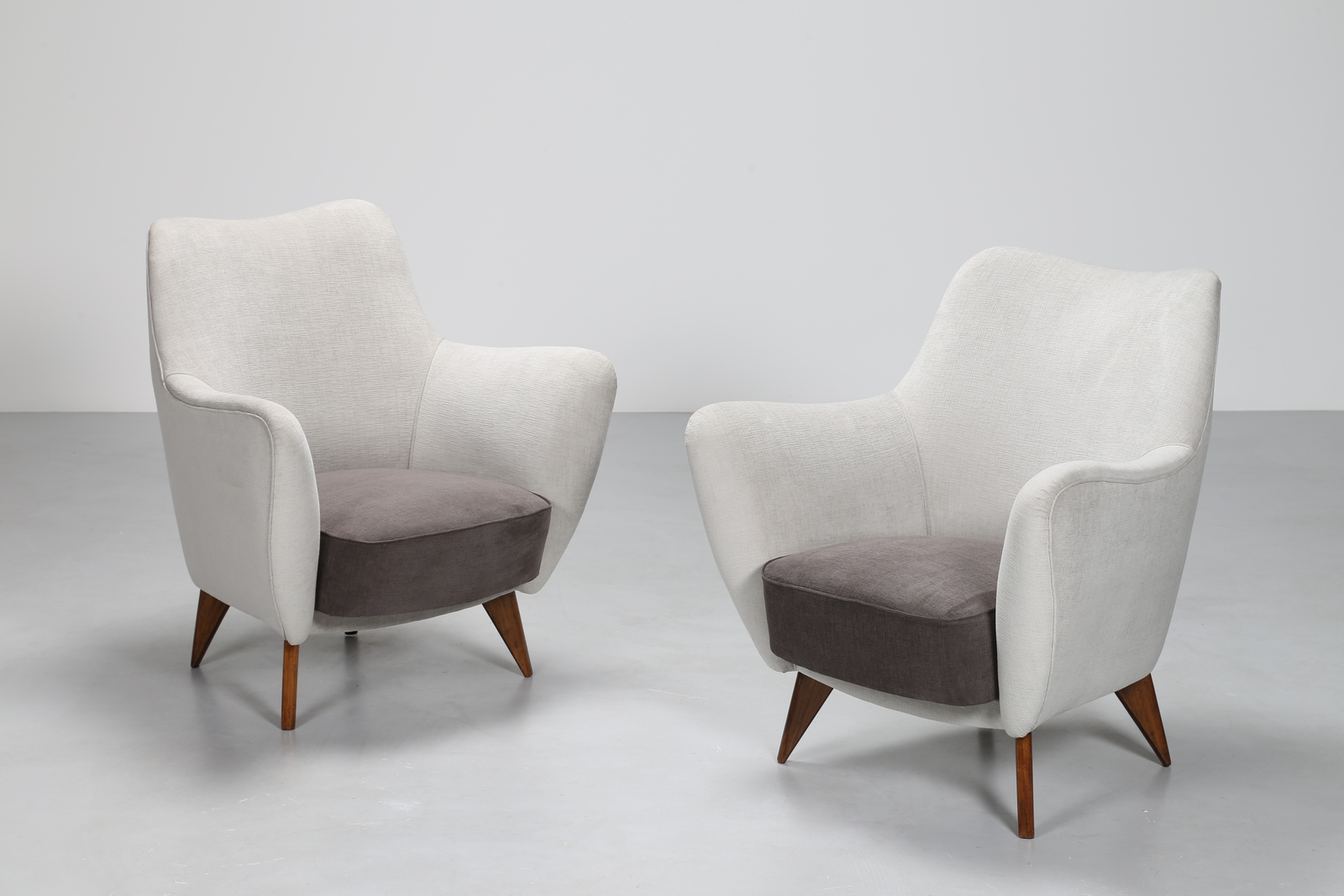 VERONESI GUGLIELMO Coppia di poltrone mod. Perla, struttura in legno, rivestimento in tessuto, Prod. I.S.A. 1950. Bib. Domus, n. 274, ottobre 1952, pagina pubblicitaria. . Tessuto e legno. Cm 81,00 x 88,00 x 80,00.