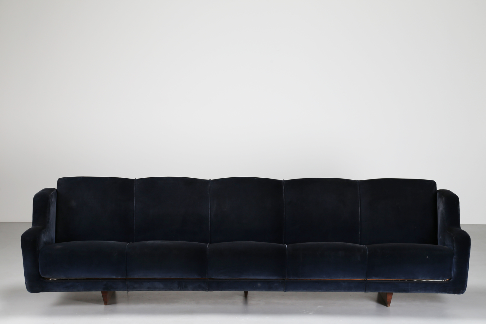 BEGA MELCHIORRE (1898 - 1976) Grande divano in velluto blu, facente parte dell'arredo di una villa anch'essa progettata dall'architetto nel 1948 sui colli bolognesi . Legno e tessuto. Cm 306,00 x 86,00 x 76,00. anni 40
