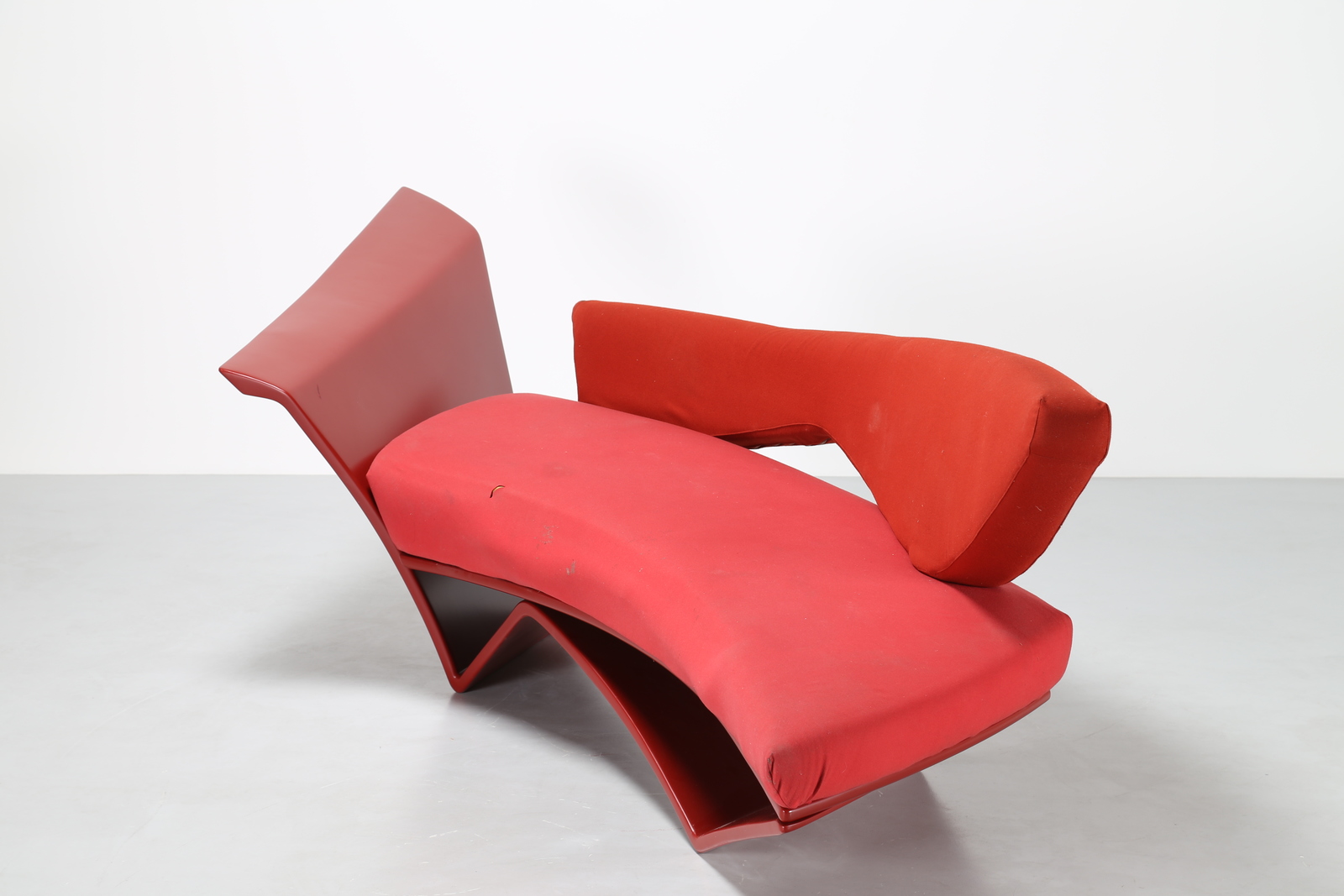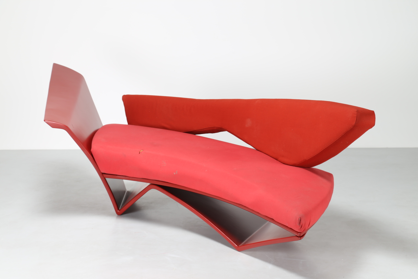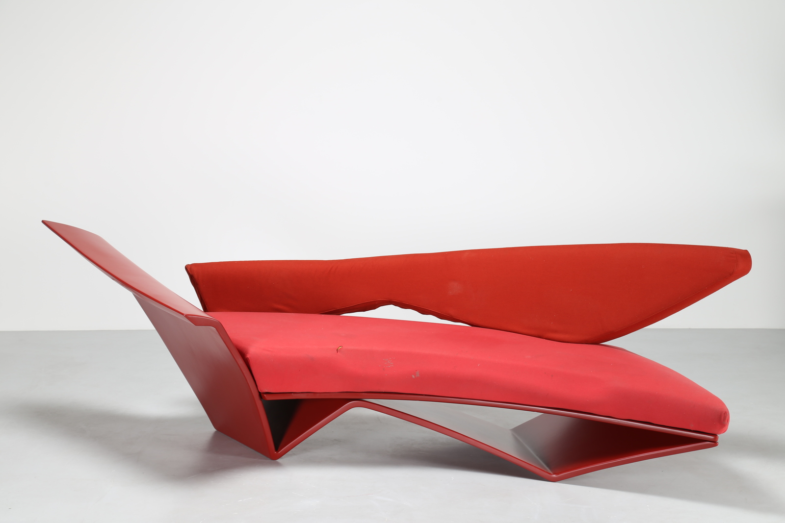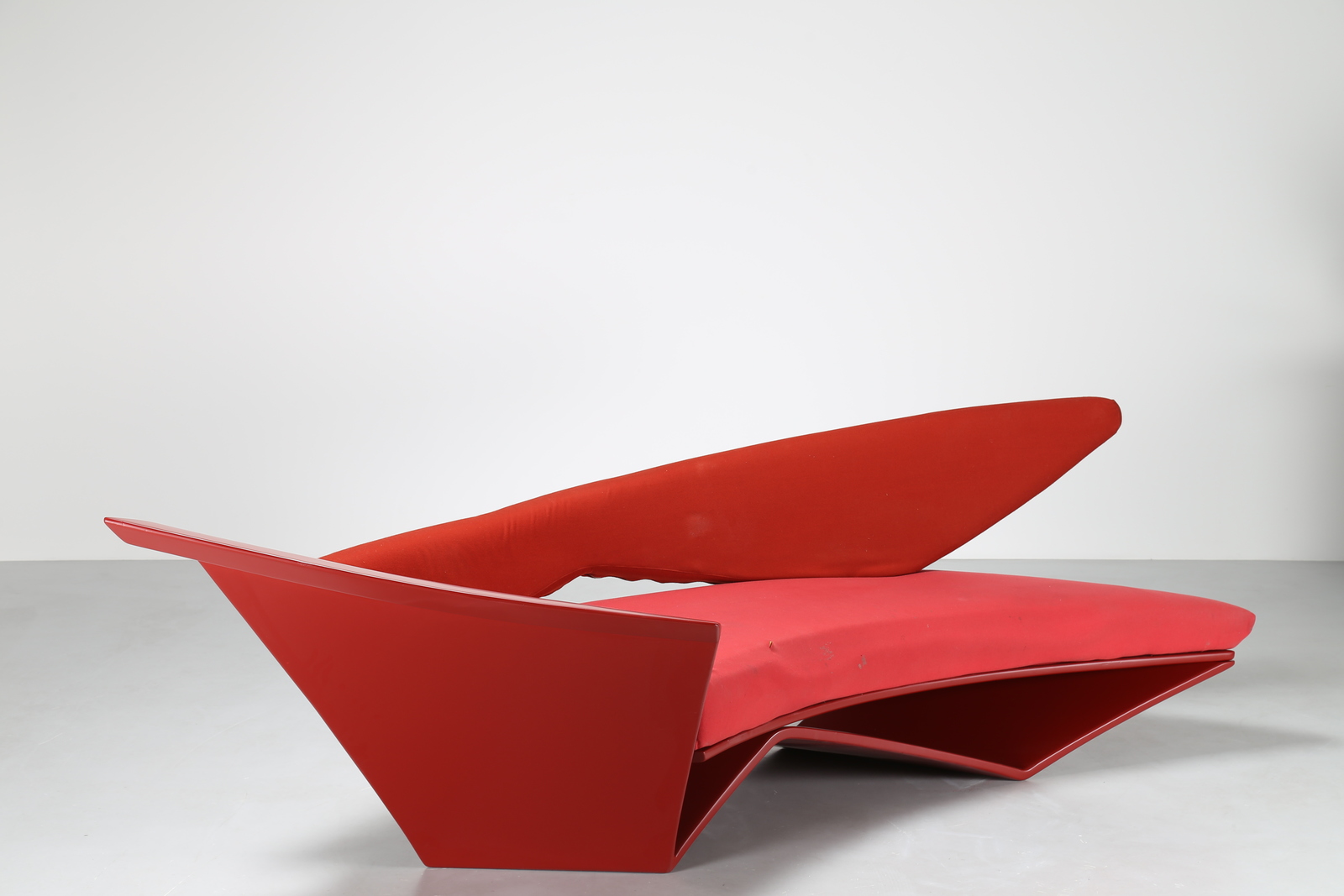 HADID ZAHA (n. 1950) Per Edra. Divano in vetro resina e tessuto collezione Wave, presentato a Milano alla discoteca studio nel 1988, modello voluto da Massimo Morozzi all'interno di un progetto per EDRA Mazzei e sviluppato in tre diverse tipologie. 1988. Vetroresina e tessuto. Cm 100,00 x 300,00 x 92,00.
