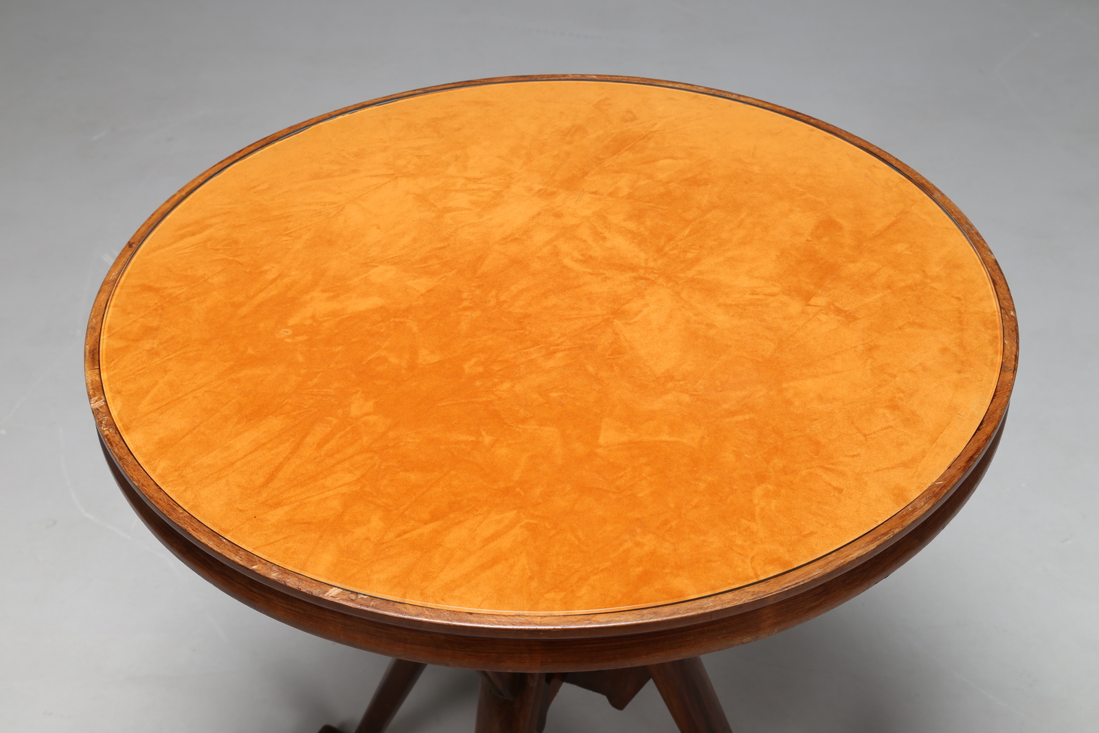 CIUTI ENRICO (n. 1910) Tavolino tondo realizzato nella breve collaborazione con Figli di Amedeo Cassina tra il 1948/55 fancenti parte di un albergo termale del centro Italia. Presente etichetta. Legno di noce e vetro. Cm 70,00 x 72,00 x 70,00. anni 50