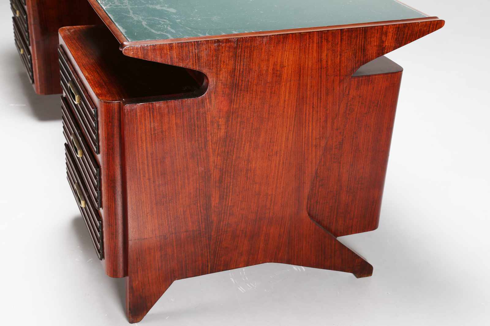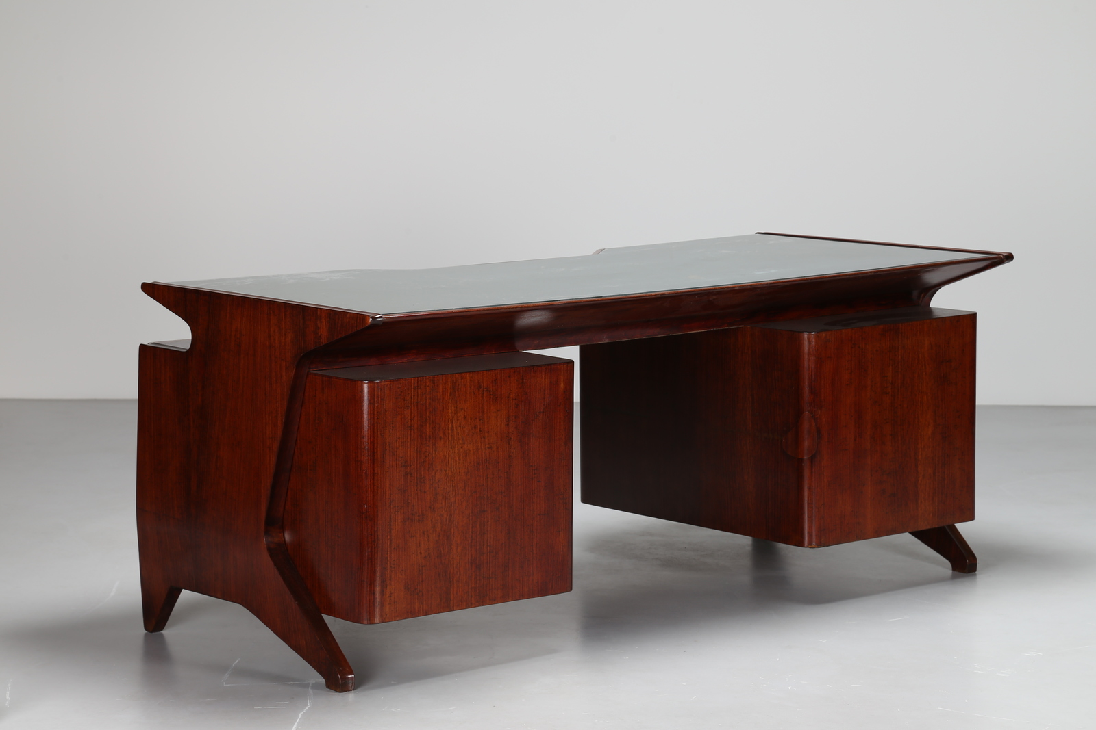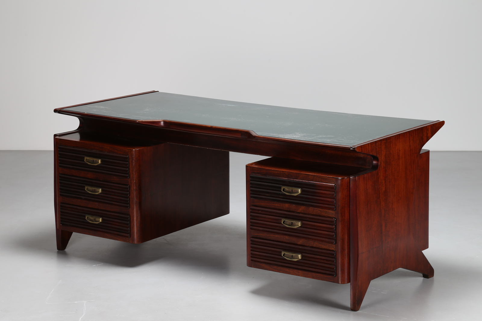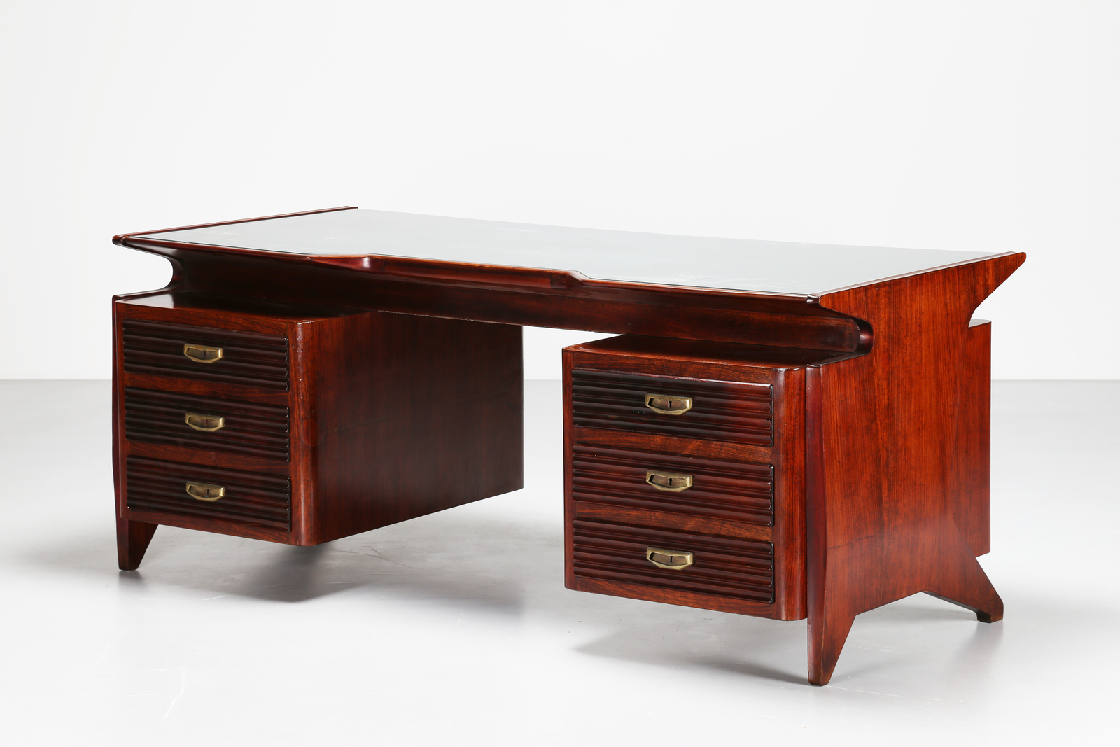 ANGELI, OLIVIERI, DE CARLI Imponente scrivania in palissandro ottone e vetro, Renato Angeli, Claudio Olivieri, Carlo De Carli, disegnata per uno studio notarile in Treviso 1948-53, (vedi libreria lotto 235 asta 182 “Ma mi faccia il piacere” Capitoliumart). Legno, ottone, vetro. Cm 190,00 x 76,00 x 90,00. anni 50