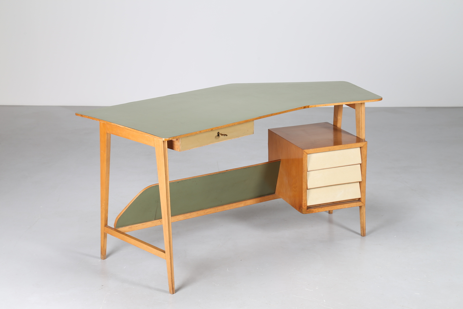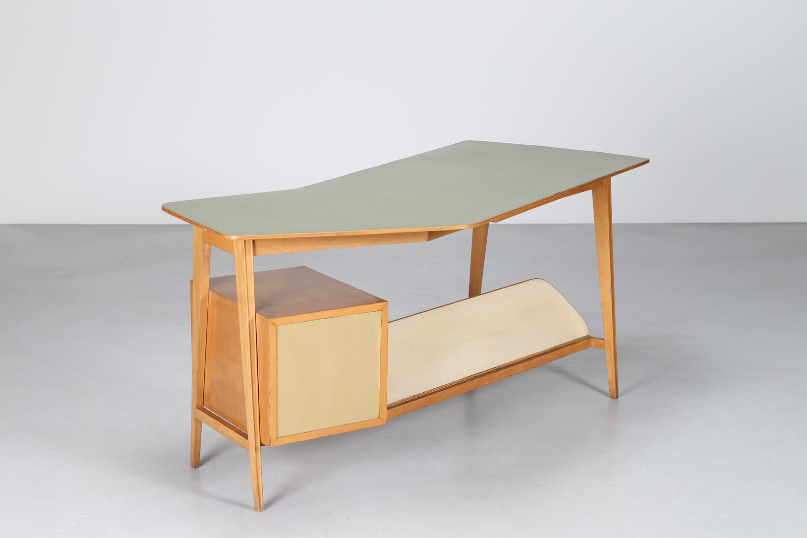 CECCHINI LIBERO (n. 1919) Scrivania curva in legno e formica, eseguita dall'ebanisteria Giuseppe Lussana San Bonifacio VR. Bib. pagina pubblicitaria rivista dell'arredamento dicembre 1955, . Legno e formica. Cm 165,00 x 79,00 x 90,00. anni 50
