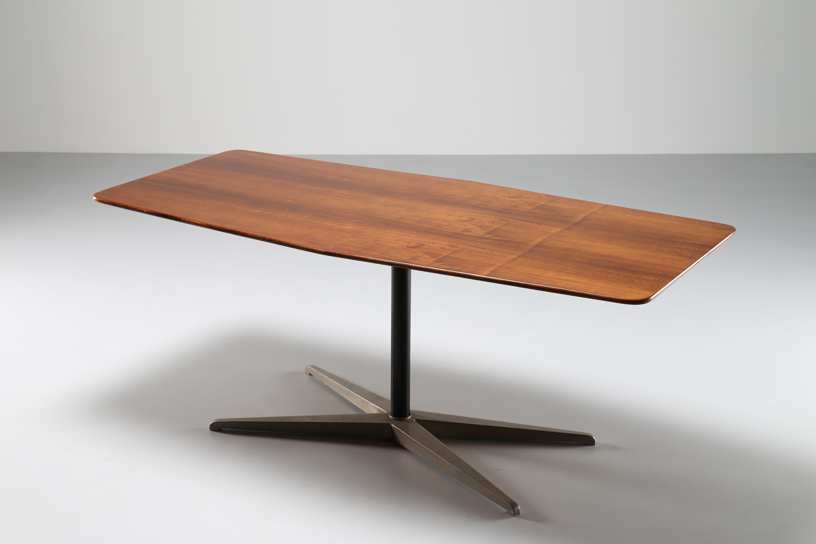 PONTI GIO' (1891 - 1979) Tavolo rettangolare in noce e metallo mod.Bt 201, per RIMA, 1955. Milano Bib. Catalogo Gastone Rinaldi - Designer alla RIMA a cura di Giuseppe e Jacopo Drago, pag.209. Expertise a cura di Salvatore Licitra - Archivio Gio Ponti. Legno di noce, acciaio e alluminio. Cm 182,00 x 72,50 x 86,00.