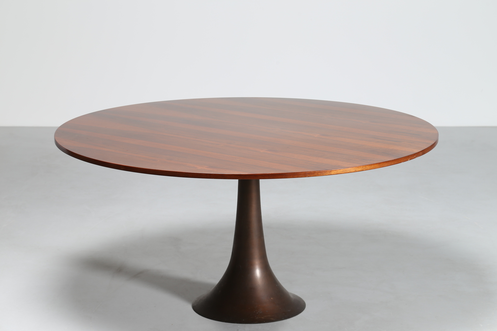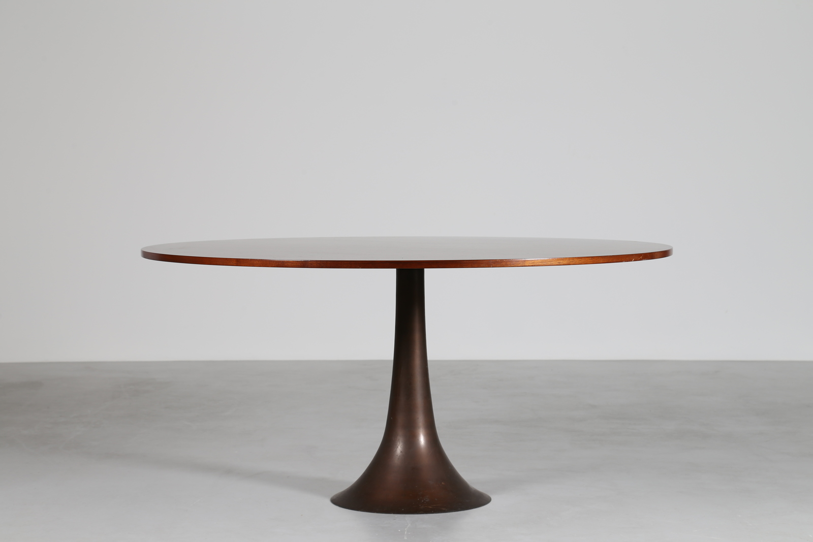 MANGIAROTTI ANGELO (n. 1921) Tavolo in fusione di bronzo finita al tornio e legno di noce, prod, Bernini, Italia, 1959 Bib. Domus 400 (marzo 1963), pubblicità; Domus 408 (novembre 1963), pubblicità e p. 41; Ottagono 3 (ottobre 1966), p. 78; Ottagono 8 (gennaio 1968), p. 102; I. de Guttry, M. P. Maino, Il Mobile Italiano degli anni ‘40 e ‘50, p. 200 (esemplare simile), Laterza, 2010. . 1960. Legno e bronzo. Cm 150,00 x 72,00 x 150,00.